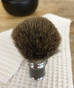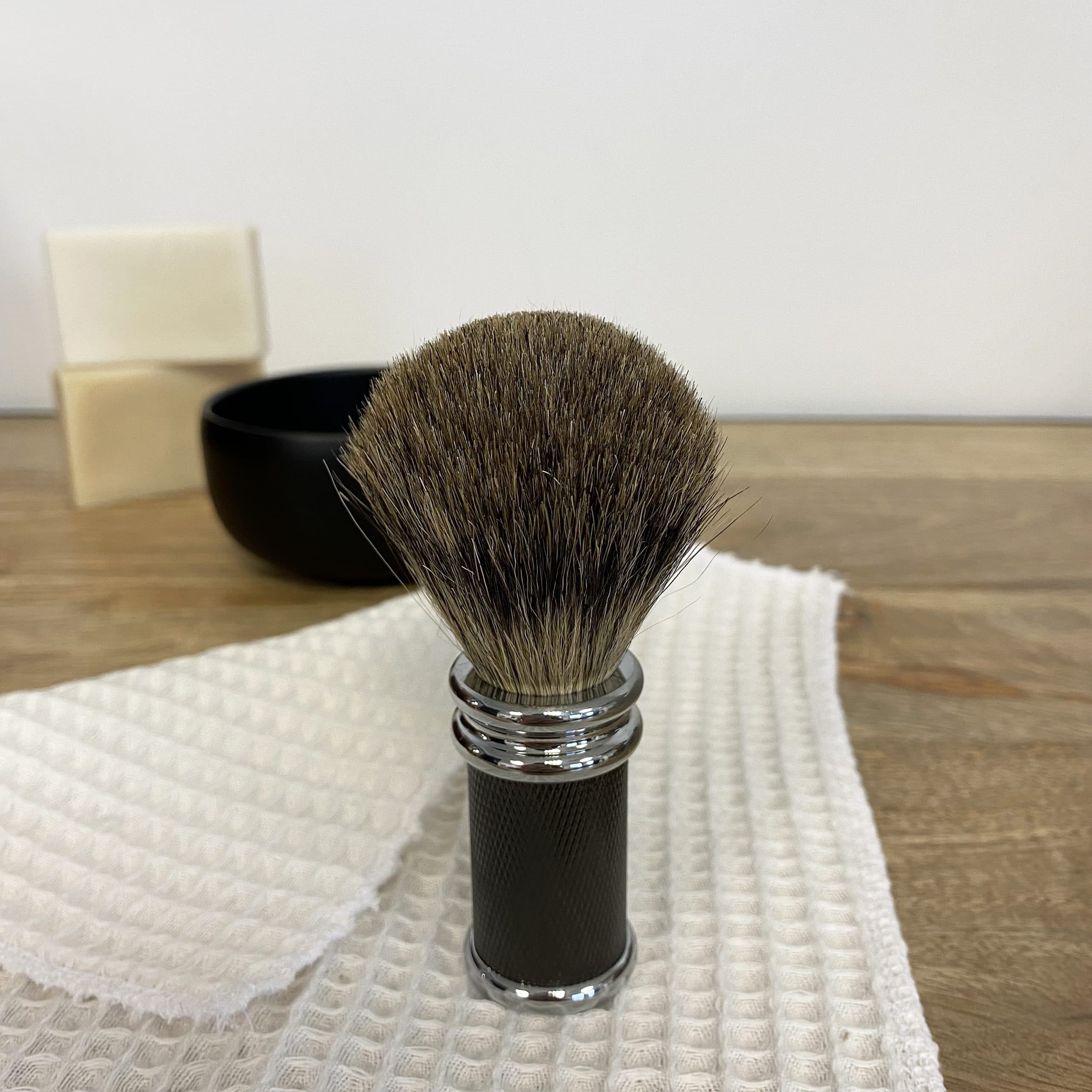 Blaireau en poils naturels conçu pour le rasage de votre barbe, manche aspect métallique pour un résultat chic et classe.