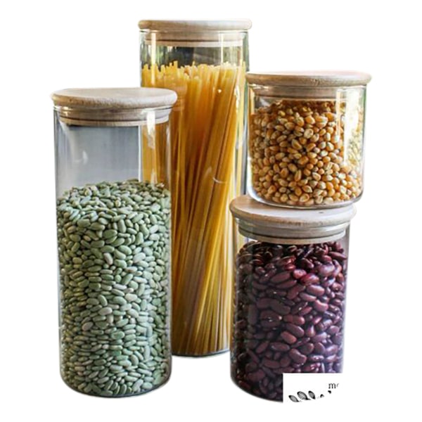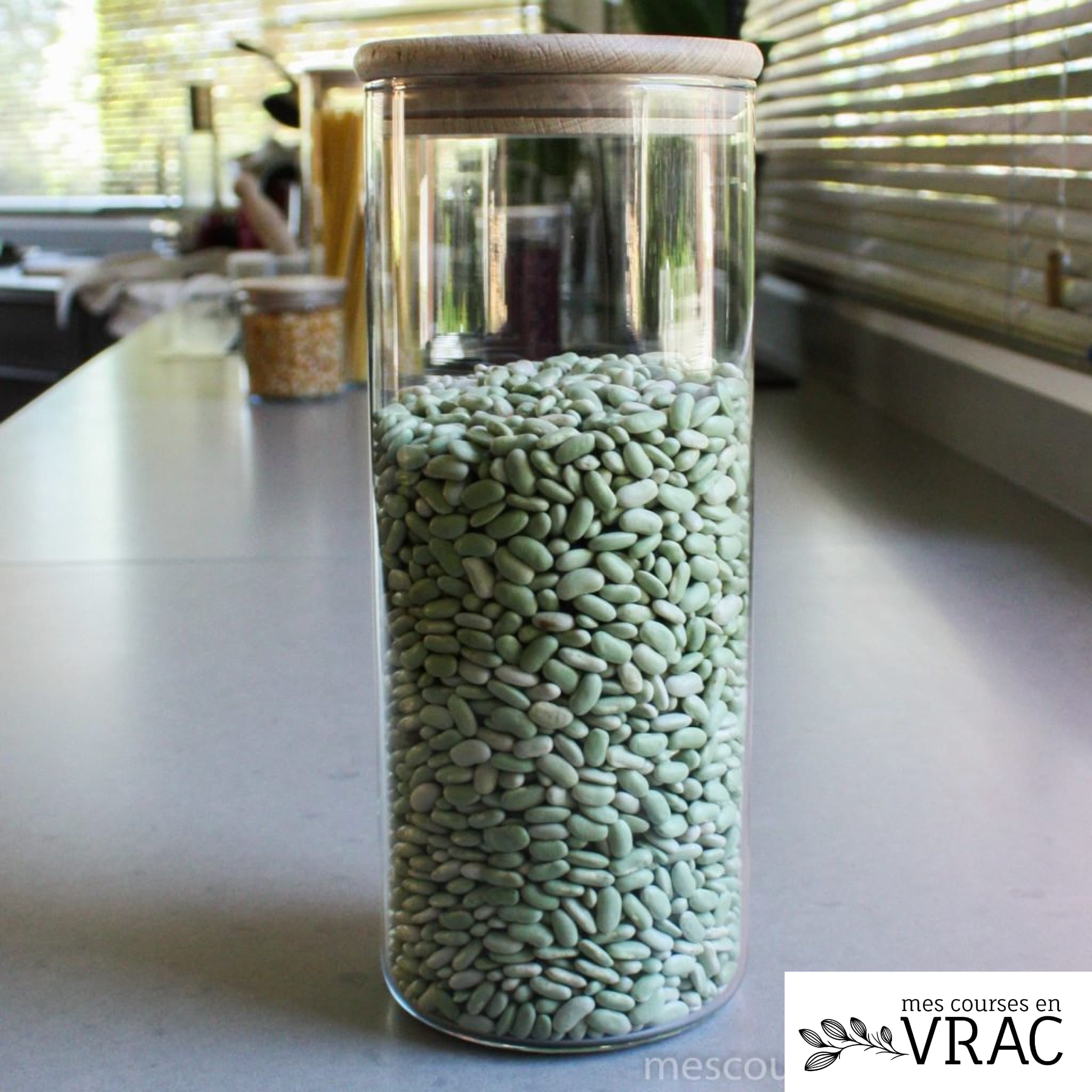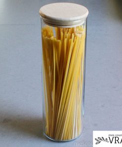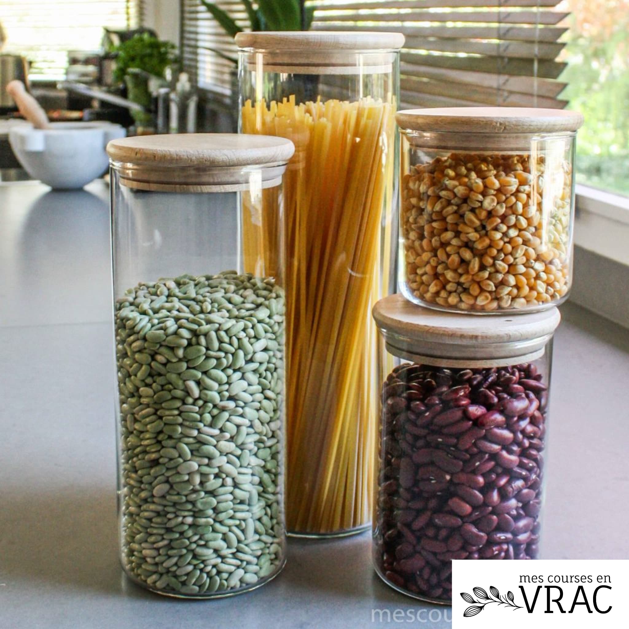 Ces bocaux en verre avec bouchon bois sont très pratiques pour stocker le vrac. Le verre est un matériau sain et bien adapté au contact avec les aliments et qui reste propre de lavage en lavage. Le verre permet aussi de voir dans le bocal pour évaluer les quantités restantes de chaque produit.