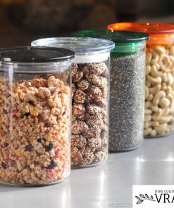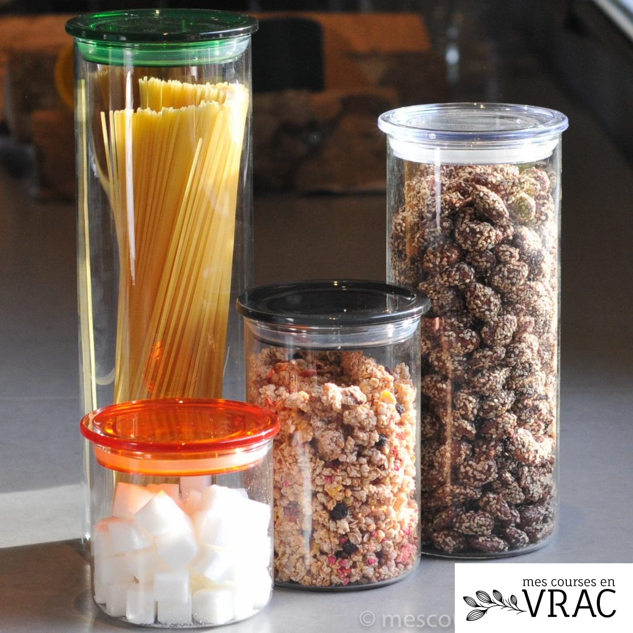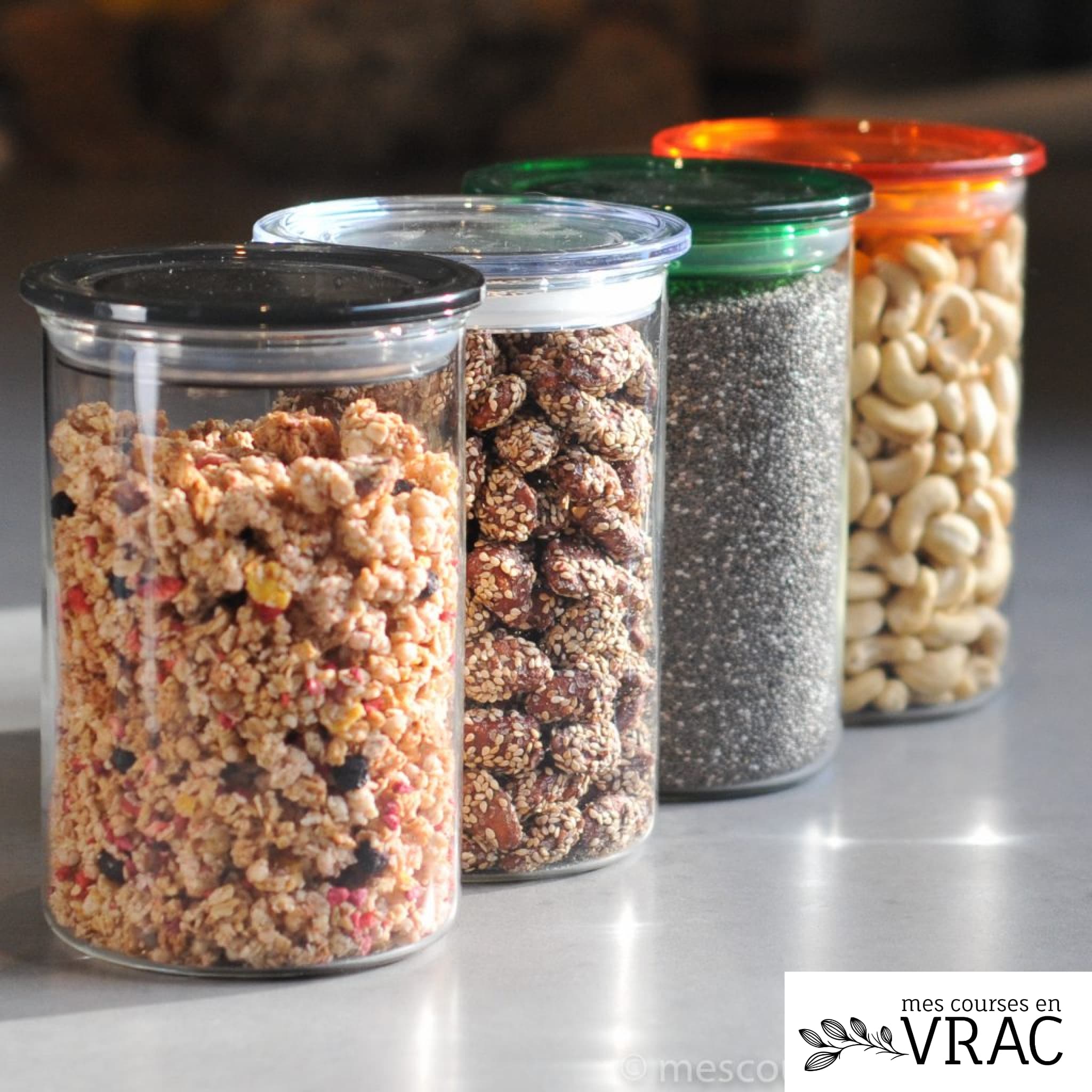 Ces bocaux en verre hermétiques sont très pratiques pour stocker le vrac. Le verre est un matériau sain et bien adapté au contact avec les aliments, qui reste propre de lavage en lavage. Le verre permet aussi de voir dans le bocal pour évaluer les quantités restantes de chaque produit.