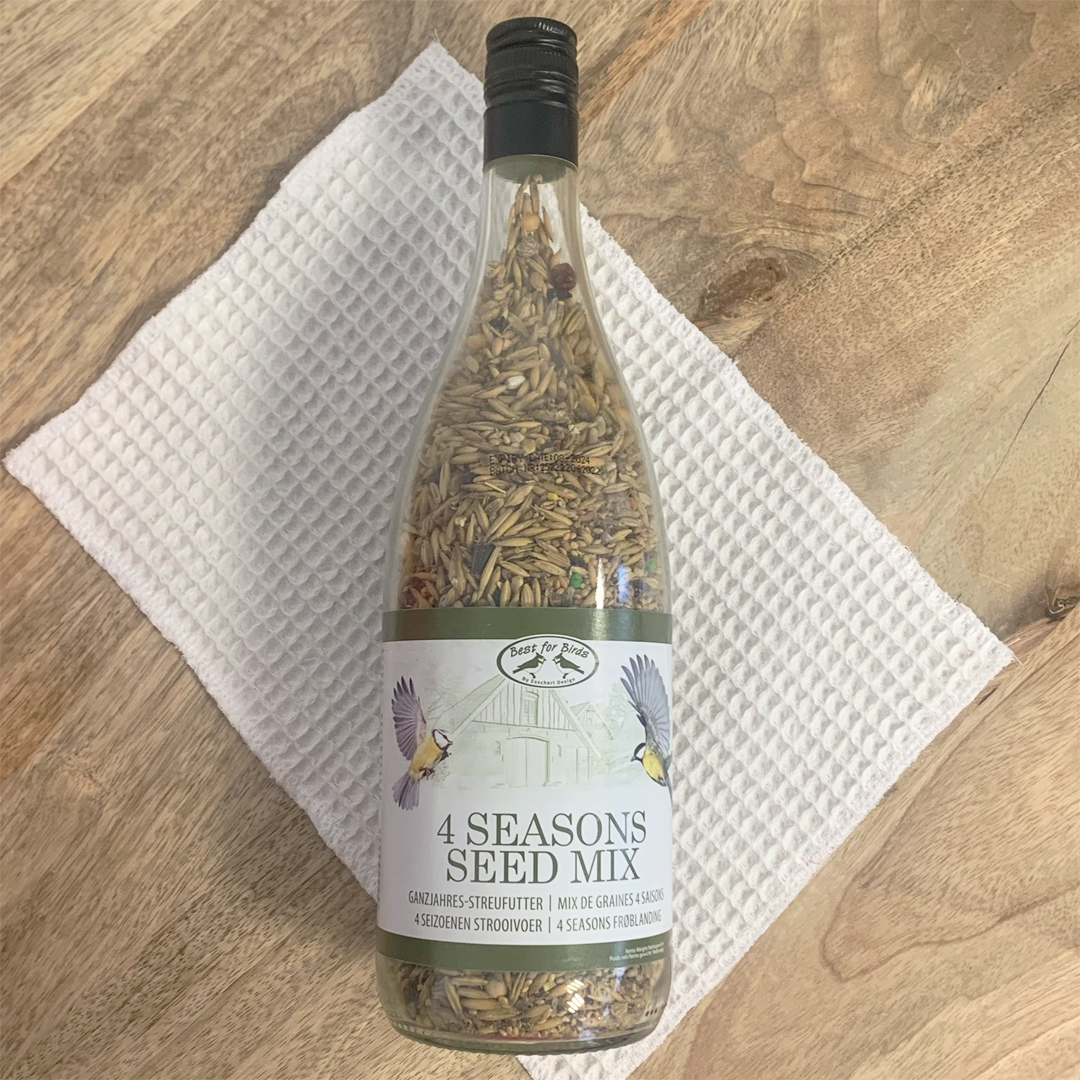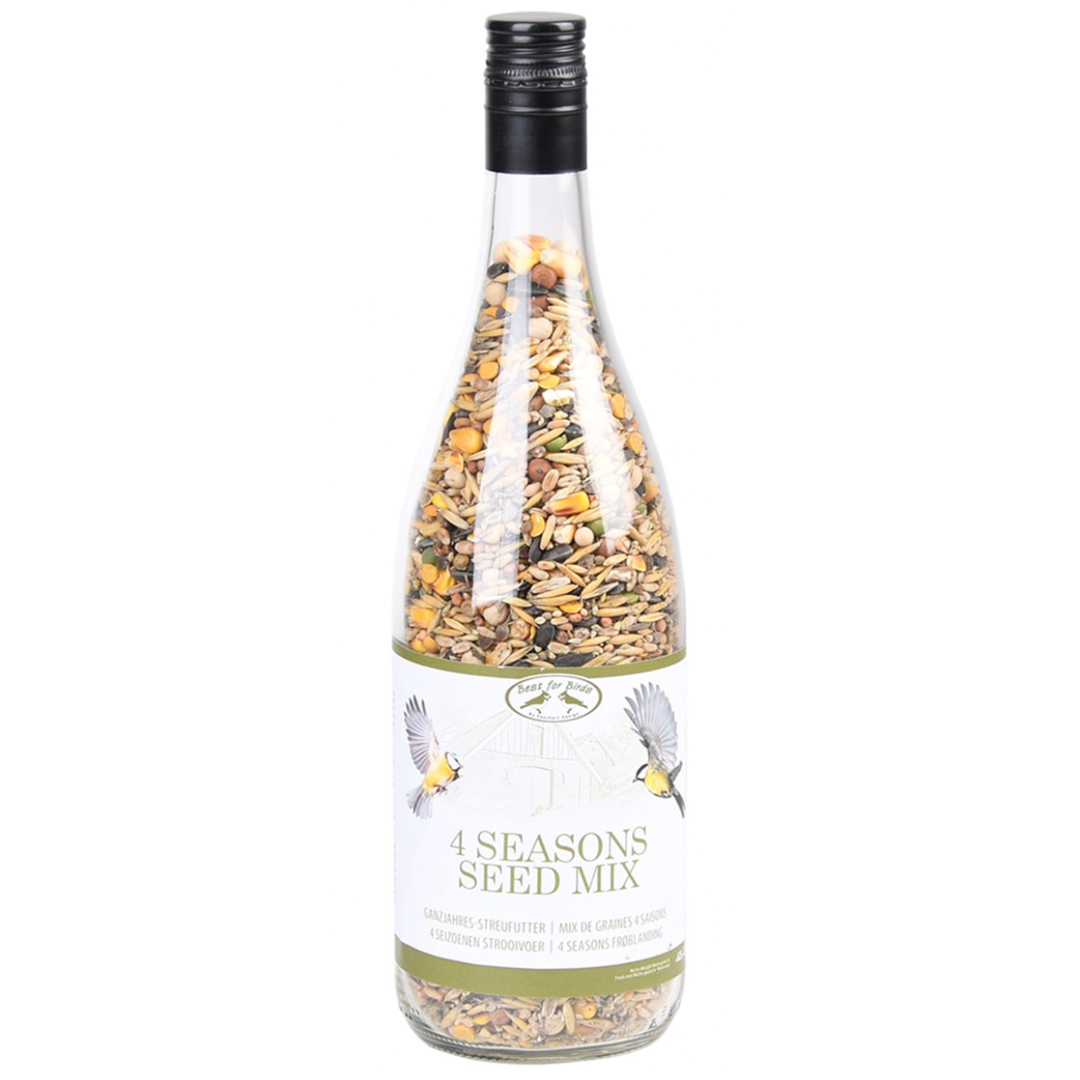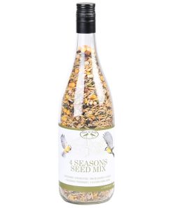 Cette bouteille en verre remplie de graines permet de nourrir les oiseaux et de stocker joliment votre nourriture pour oiseaux.