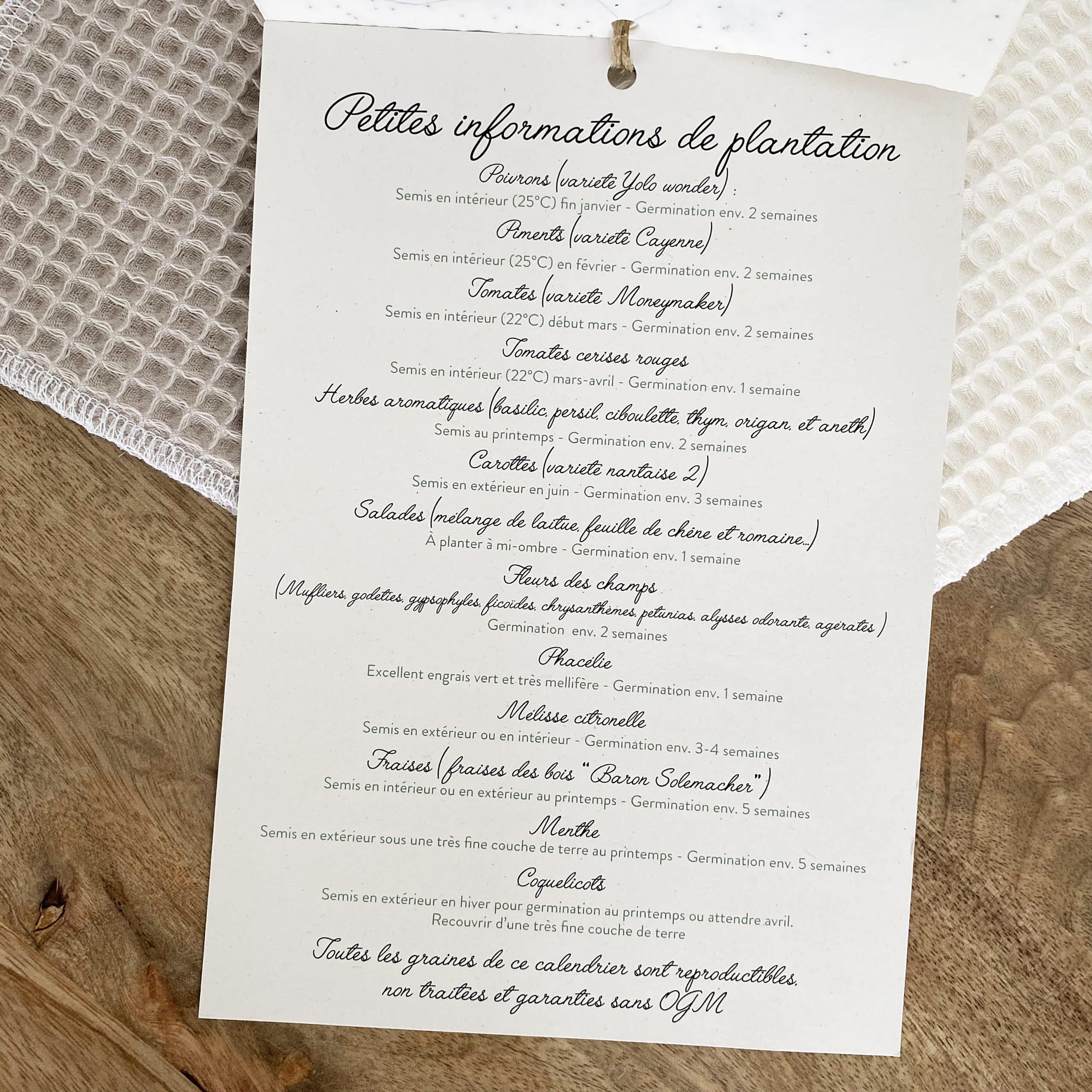 Les graines disponibles dans le calendrier : Poivrons, Piments, Tomates, Tomates cerises, Herbes aromatiques, Carottes, Salades, Fleurs des champs, Phacélie, Mélisse, Fraises, Menthe, Coquelicots