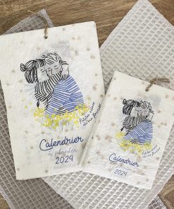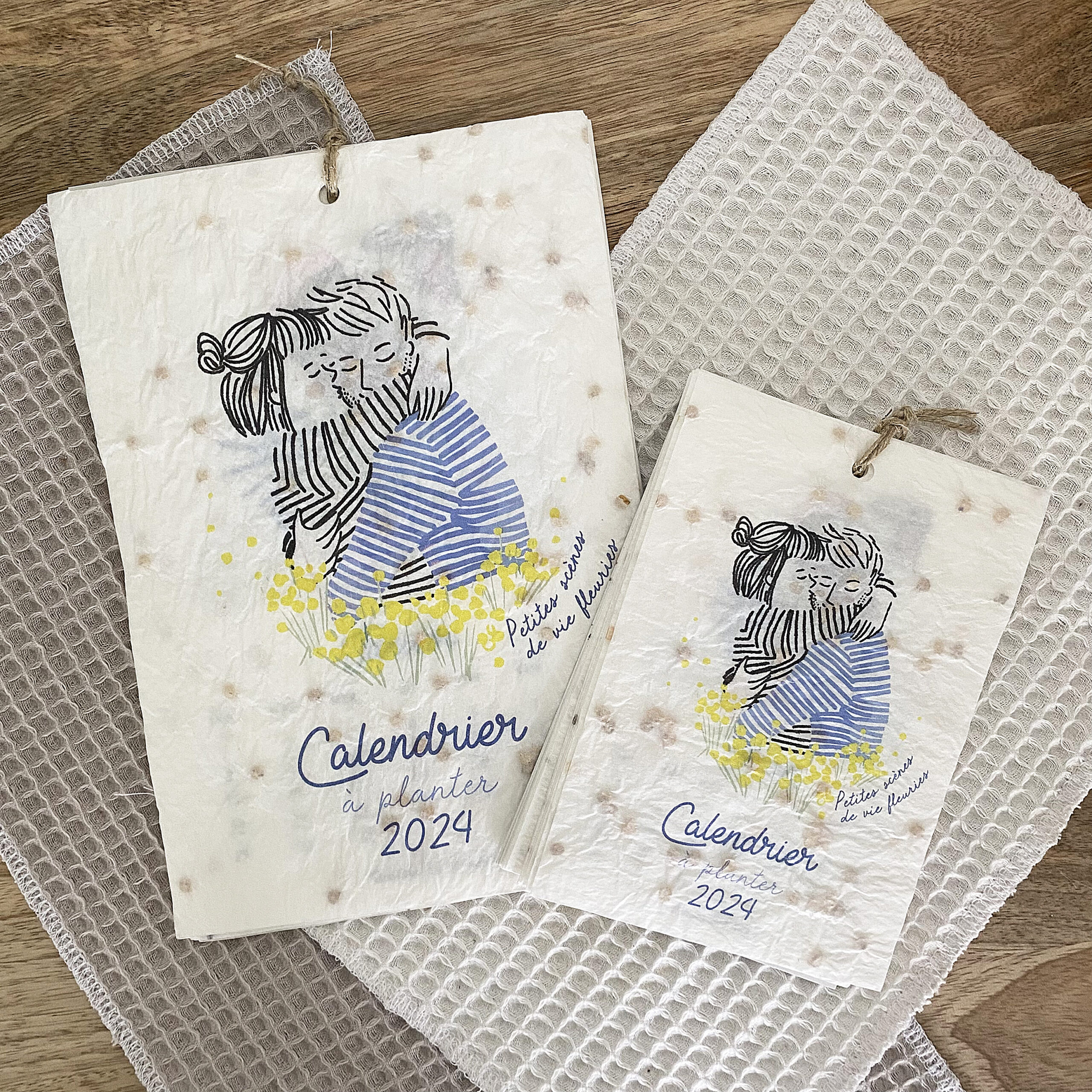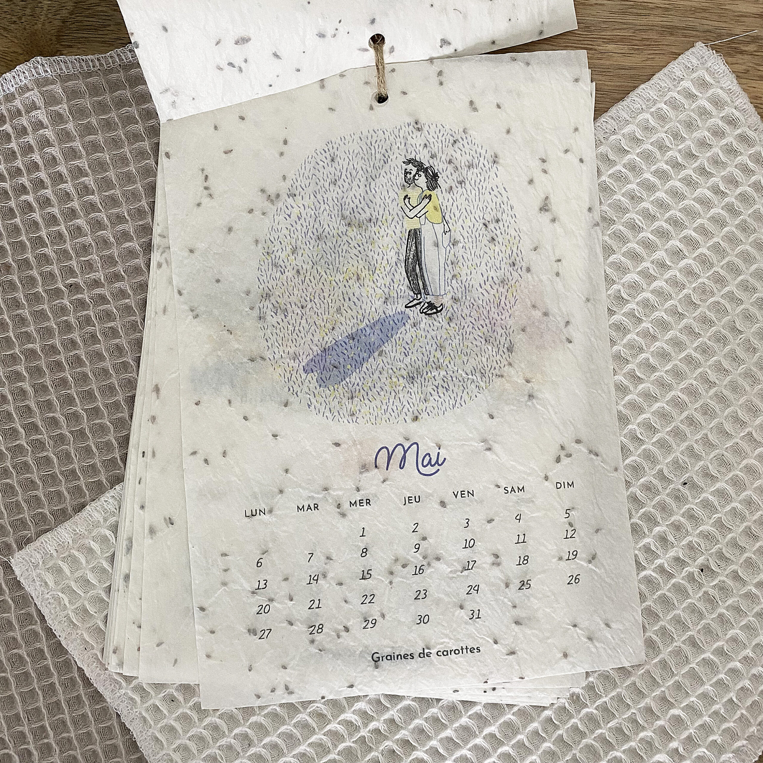 Calendrier à planter en papier naturel avec semences incorporées illustré mois par mois par des petites scènes de vie fleuries.