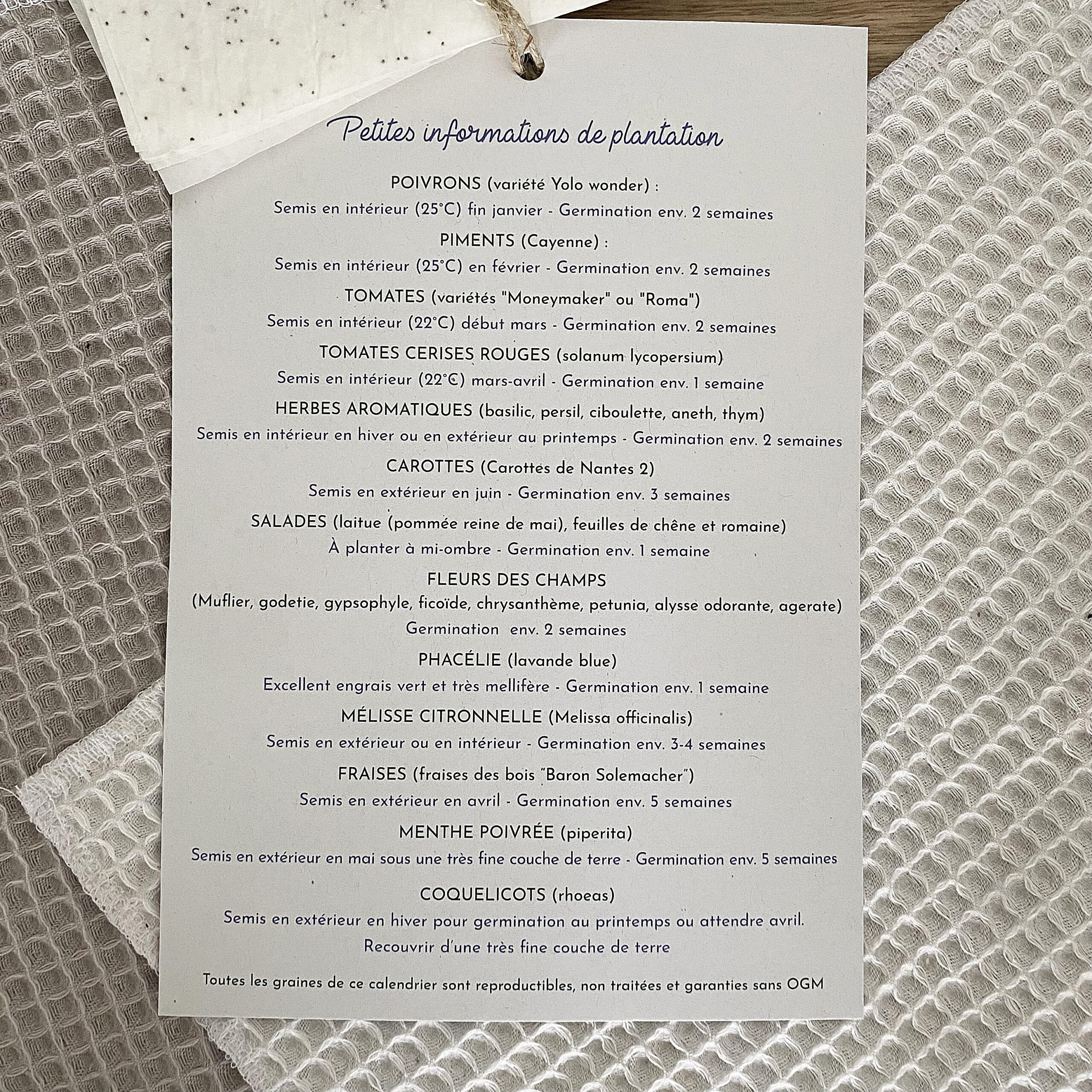 Les graines disponibles dans le calendrier : Poivrons, Piments, Tomates, Tomates cerises, Herbes aromatiques, Carottes, Salades, Fleurs des champs, Phacélie, Mélisse, Fraises, Menthe, Coquelicots