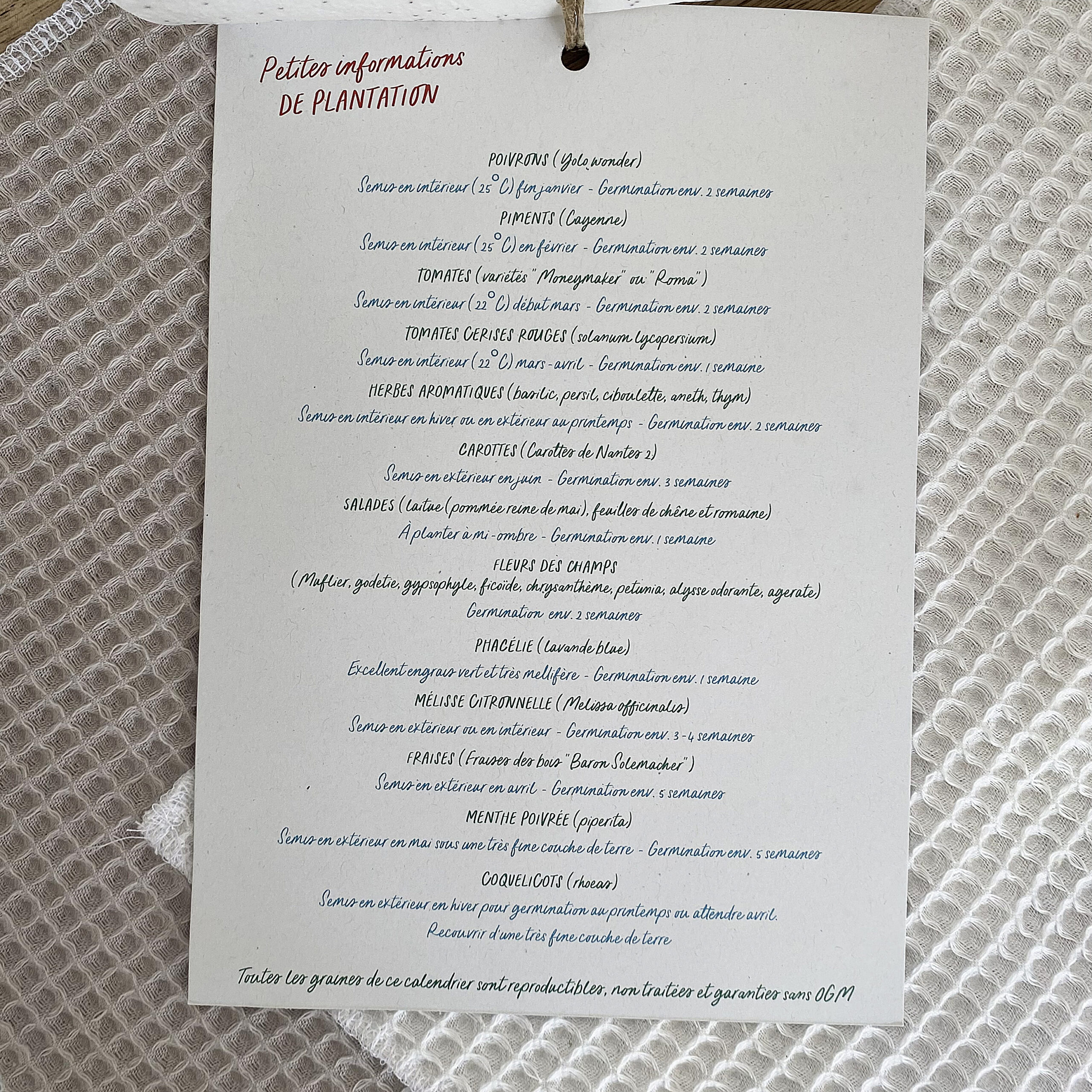 Les graines disponibles dans le calendrier : Poivrons, Piments, Tomates, Tomates cerises, Herbes aromatiques, Carottes, Salades, Fleurs des champs, Phacélie, Mélisse, Fraises, Menthe, Coquelicots