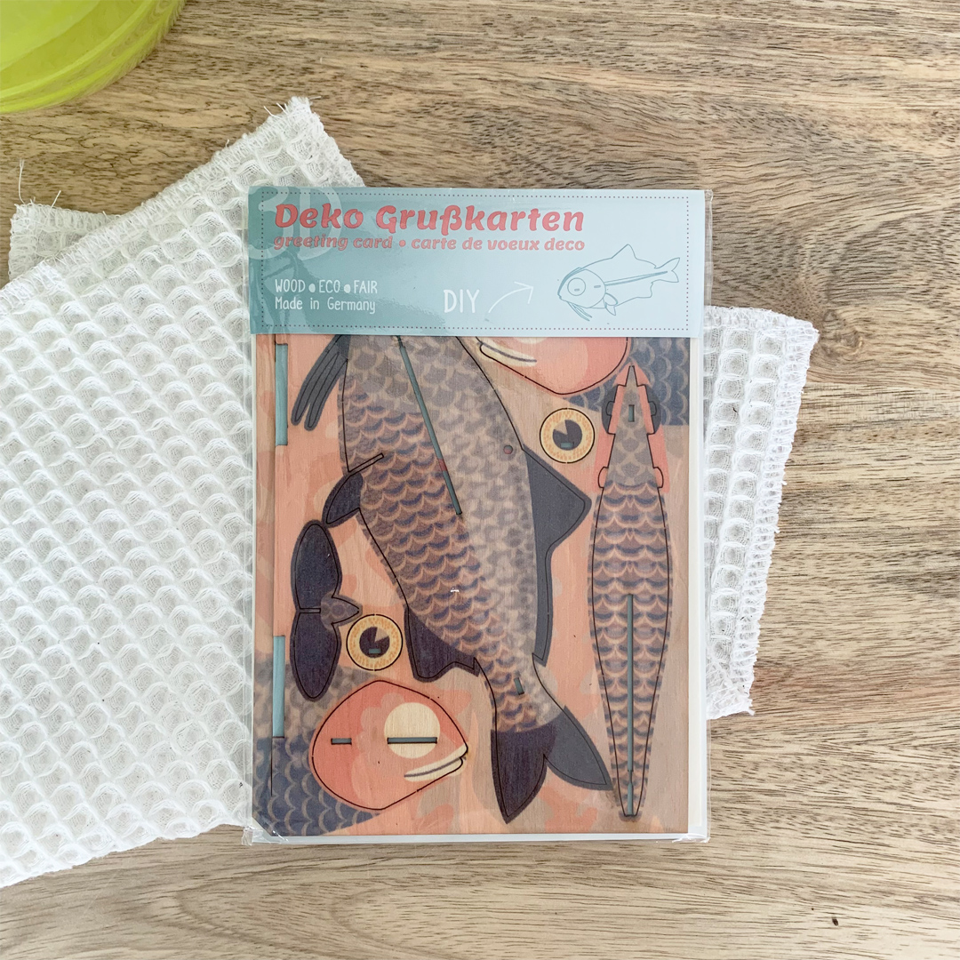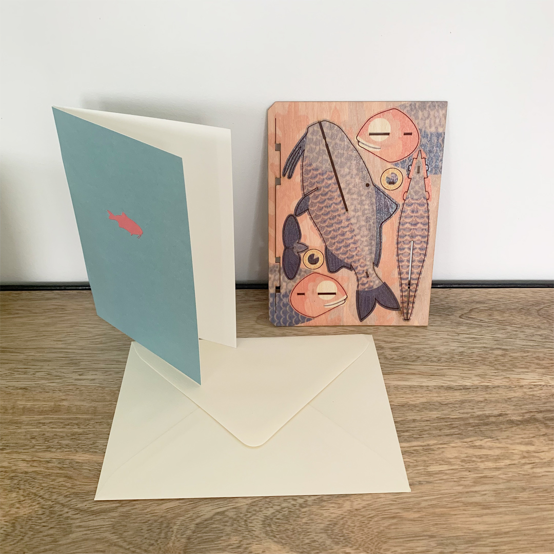 Plutôt que de produire du papier qui finira probablement dans un coin, optez pour la carte en bois sous forme d’une mini maquette qui se construit et se transforme en un joli poisson en 3D.