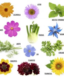 - 12 sachets de graines : Aster, Aneth, Bourrache, Coreopsis, Coriandre, Cosmos, Fenouil, Scabieuse, Lin vivace, Mélisse, Tournesol, Souci.