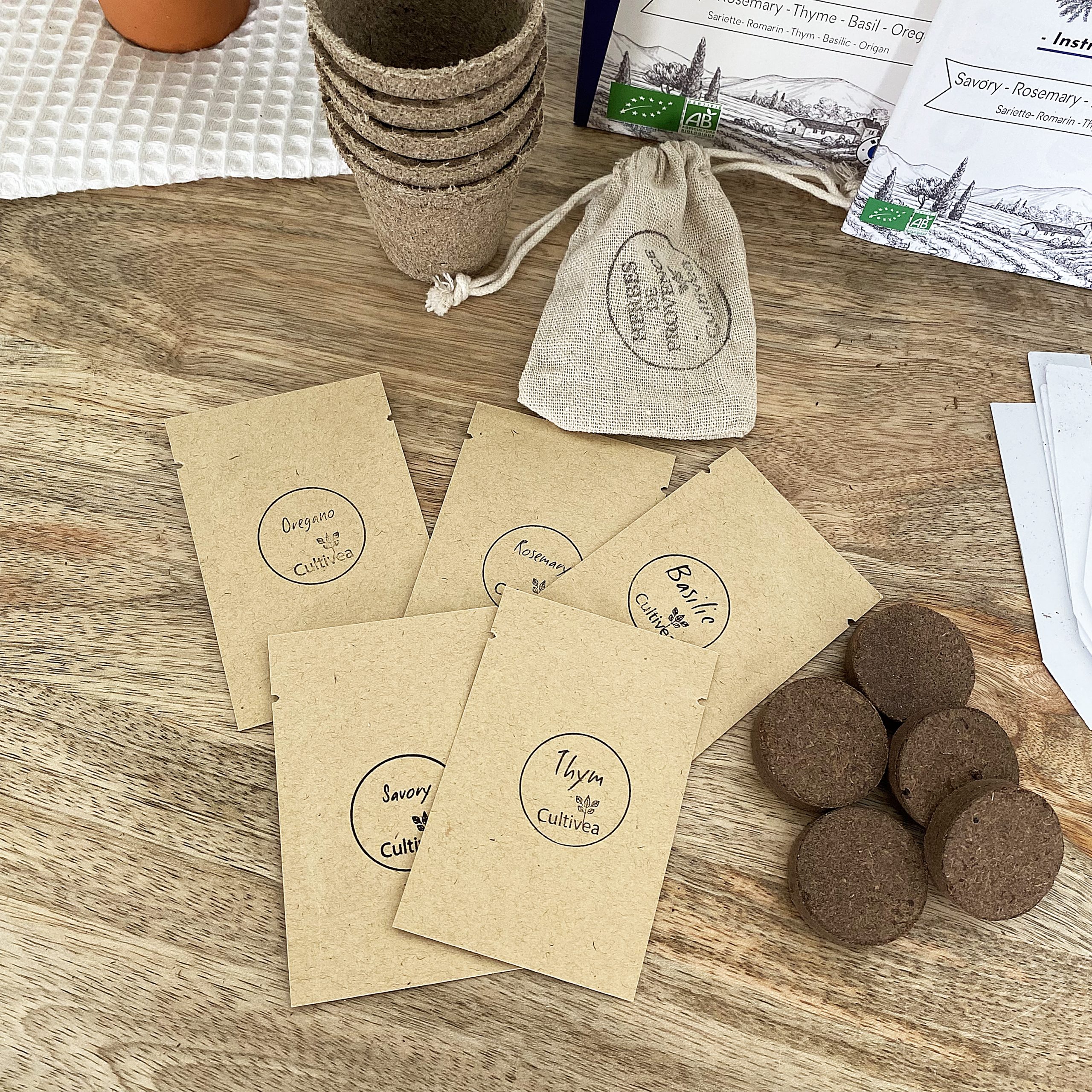 - 5 sachets de graines de thé et d’infusions BIO* différents : Sarriette, Romarin, Thym, Basilic, Origan