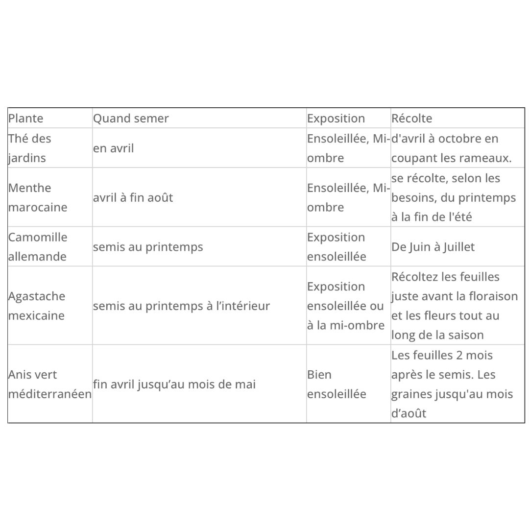 - 5 sachets de graines de thés BIO* différents : Thés des Jardins / Camomille allemande / Agastache mexicaine/ Anis vert méditérannéen / Menthe marocaine