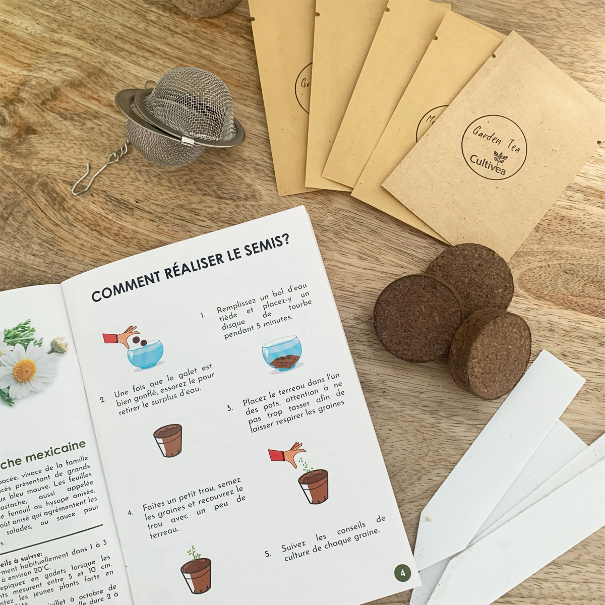 - 5 languettes de marquage pour se souvenir des graines de thés que l’on fait pousser et pour indiquer le contenu de chaque pot