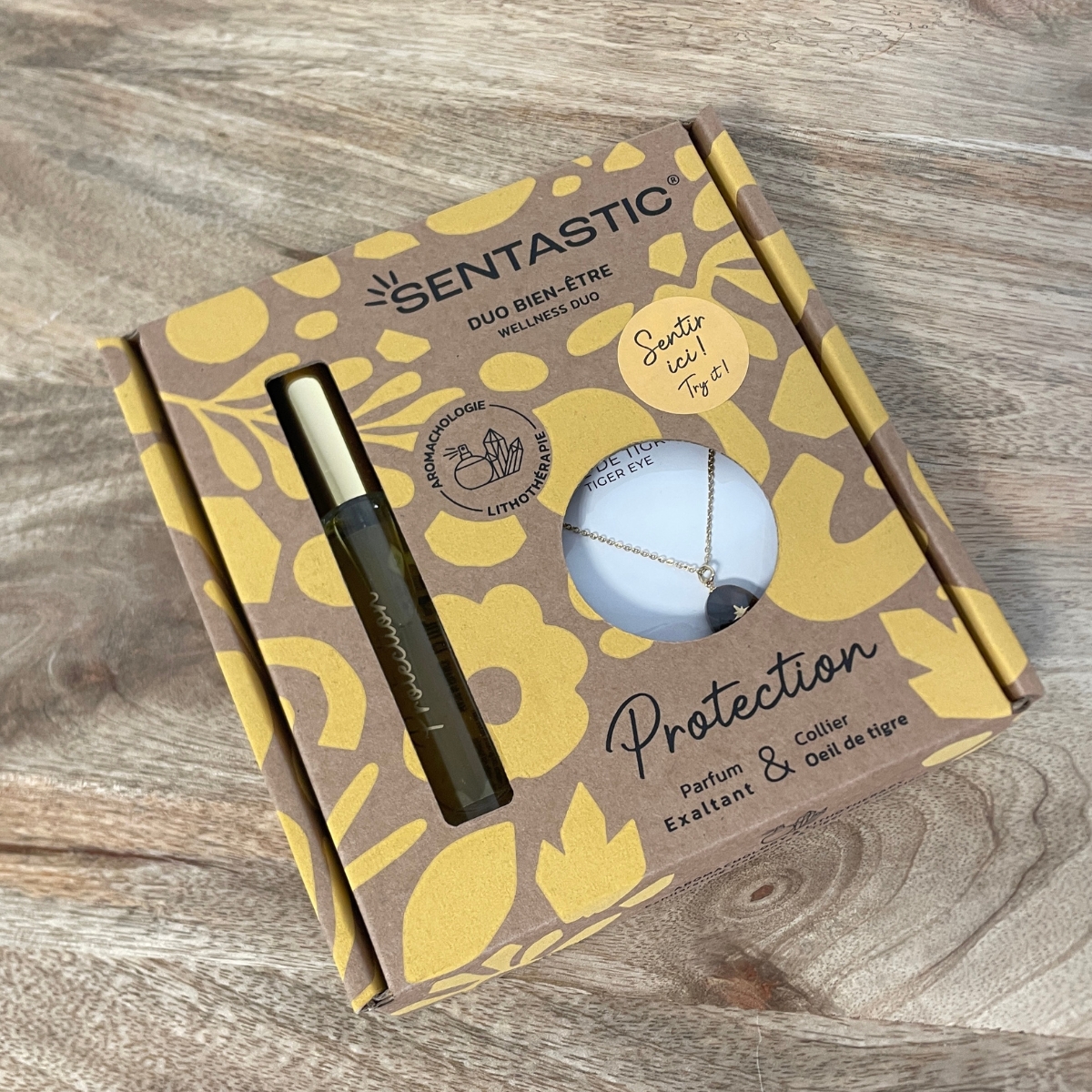 Affirmez votre présence et enveloppez-vous d’une sensation de protection absolue avec le coffret SENTASTIC protection. Ce parfum au sillage oriental et sensuel associe la fraîcheur du gingembre et du pamplemousse à la richesse du vétiver, du santal et de la tonka, créant une aura réconfortante et exaltante. En complément, un collier orné d’un œil de tigre, pierre de force et de courage, accompagne ce rituel de confiance en soi. Une harmonie parfaite entre parfum et énergie, pour renforcer votre assurance intérieure et vous entourer d’une aura de sérénité.
