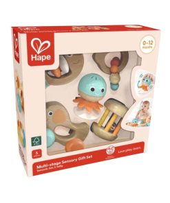 Offrez à votre bébé un éveil tout en douceur avec le coffret sensoriel 5 pièces en bois de Hape, spécialement conçu pour accompagner son développement dès la naissance.