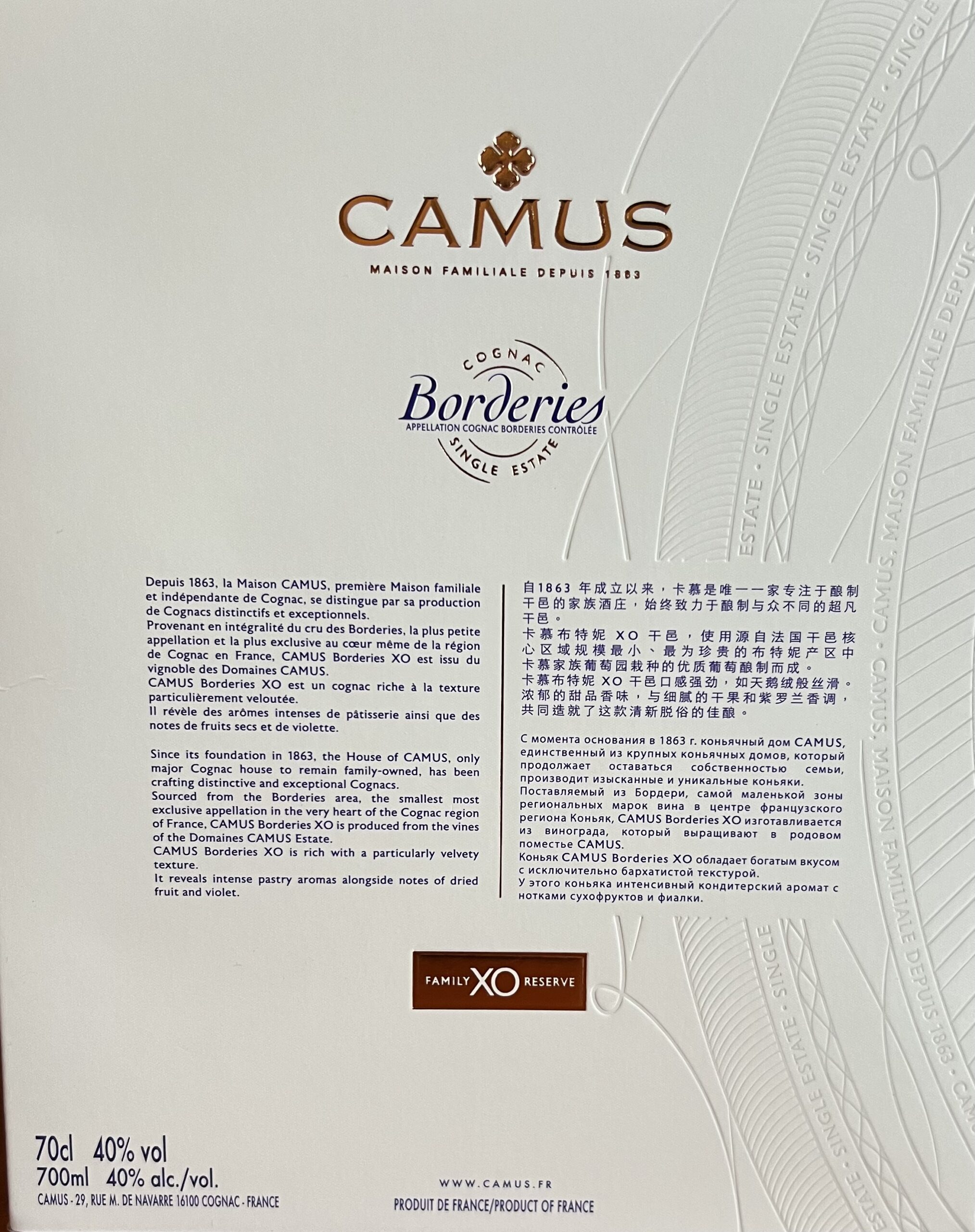 Le Camus XO Borderies est un cognac chaleureux élaboré par la Grande Marque Camus.