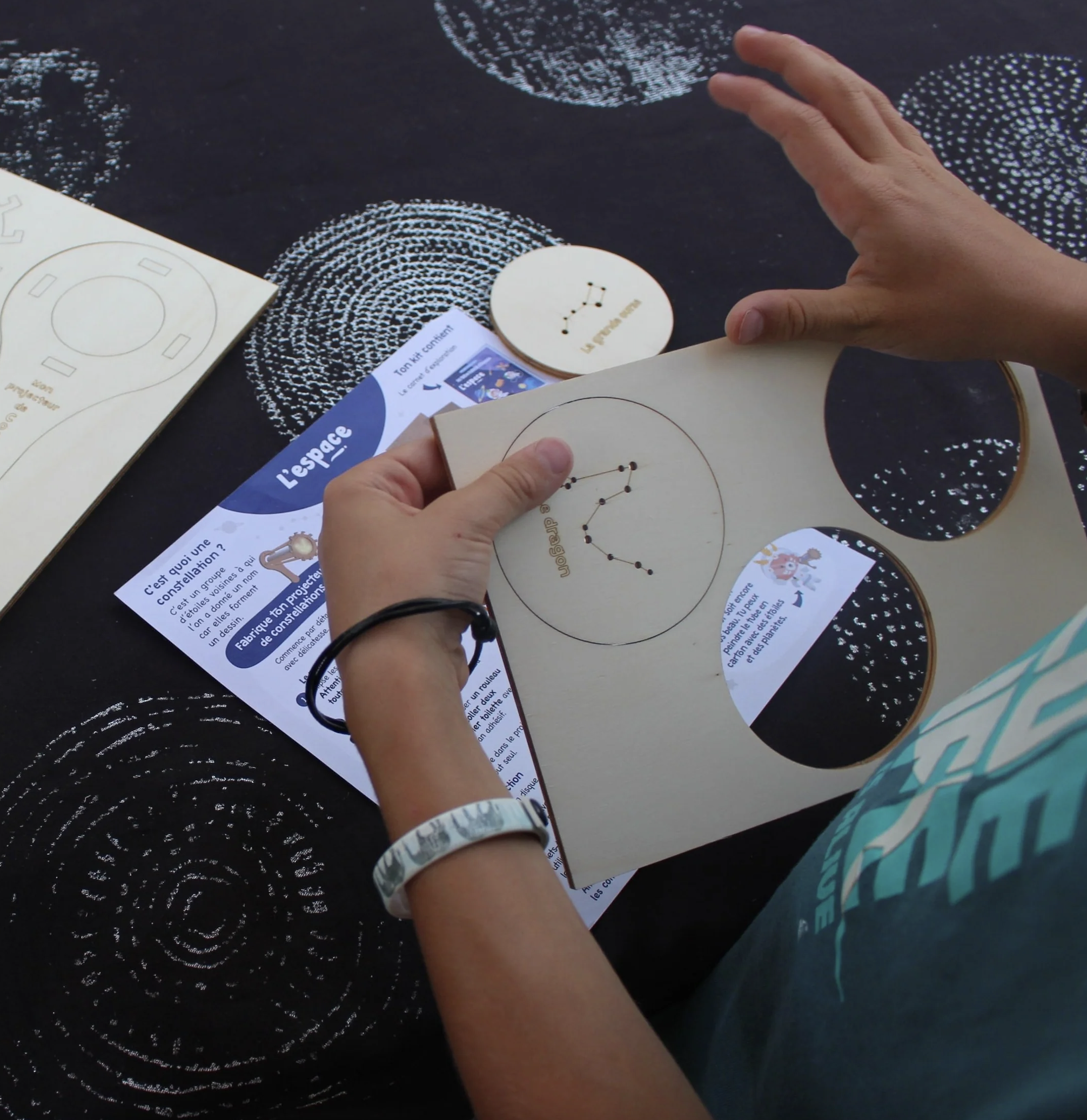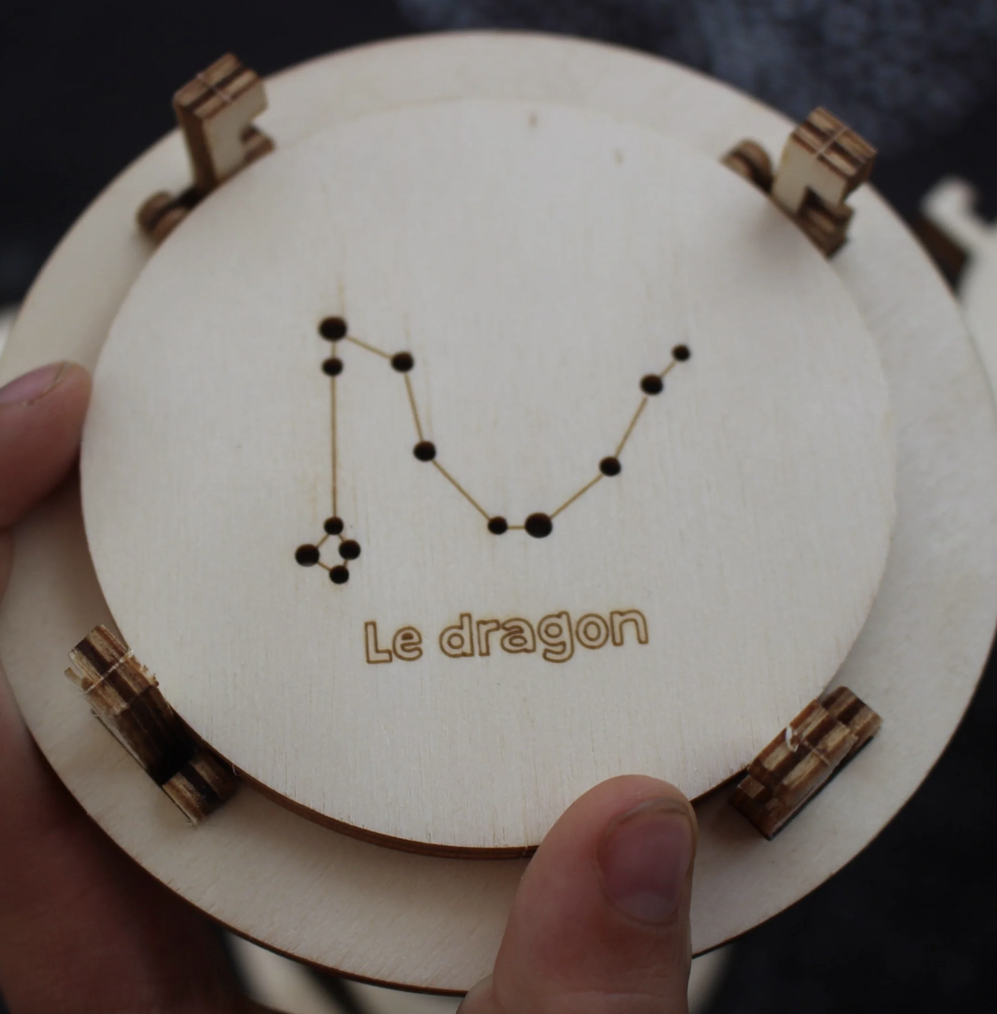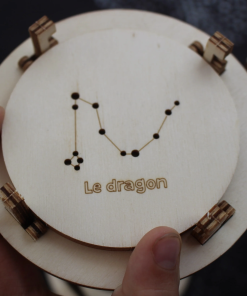 - 3 disques de constellations en bois ( La Grande Ourse, Le Dragon, Le Cygne )