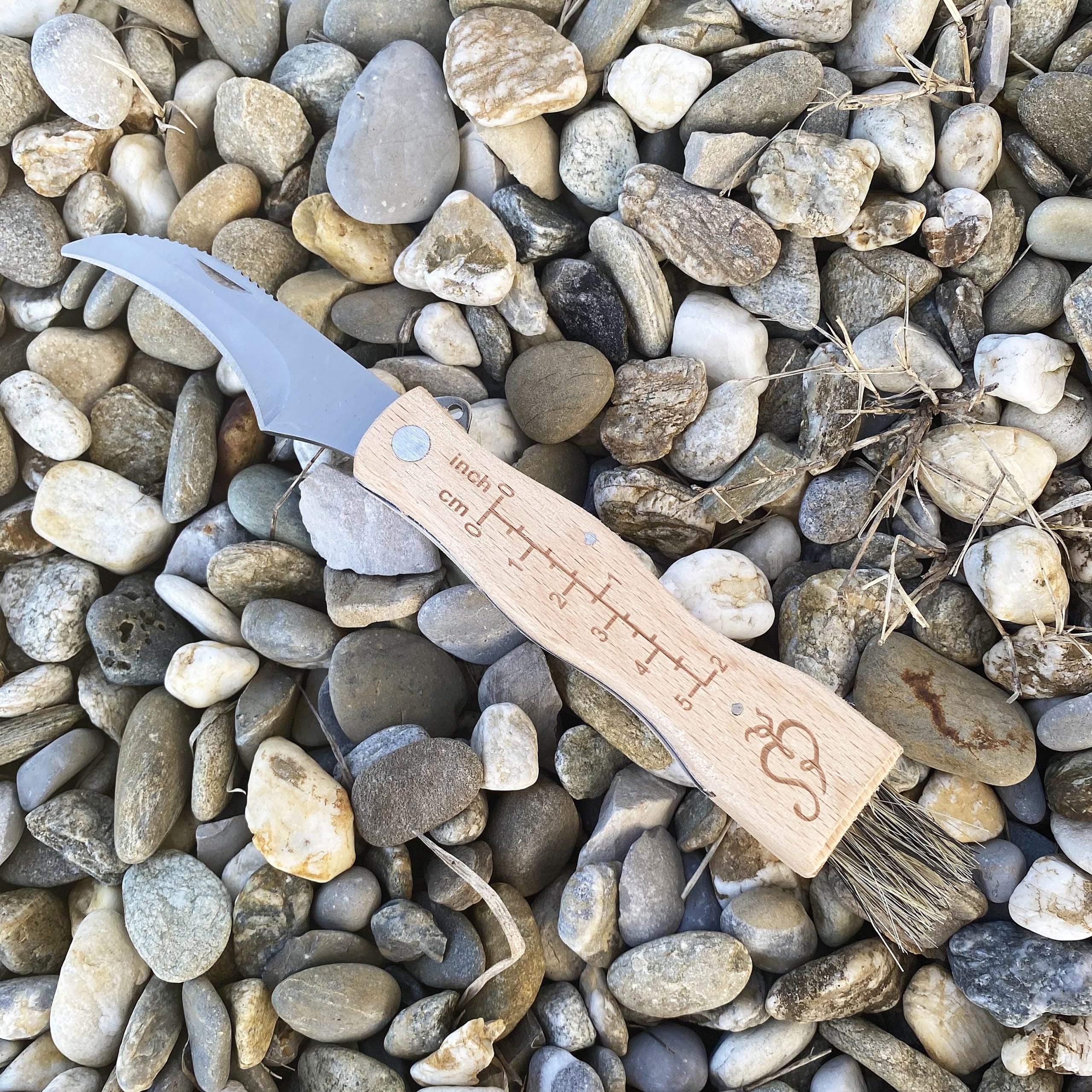 La petite brosse permet de nettoyer grossièrement le champignon sur place et les graduations sur le manche en bois de mesurer vos champignons.