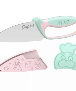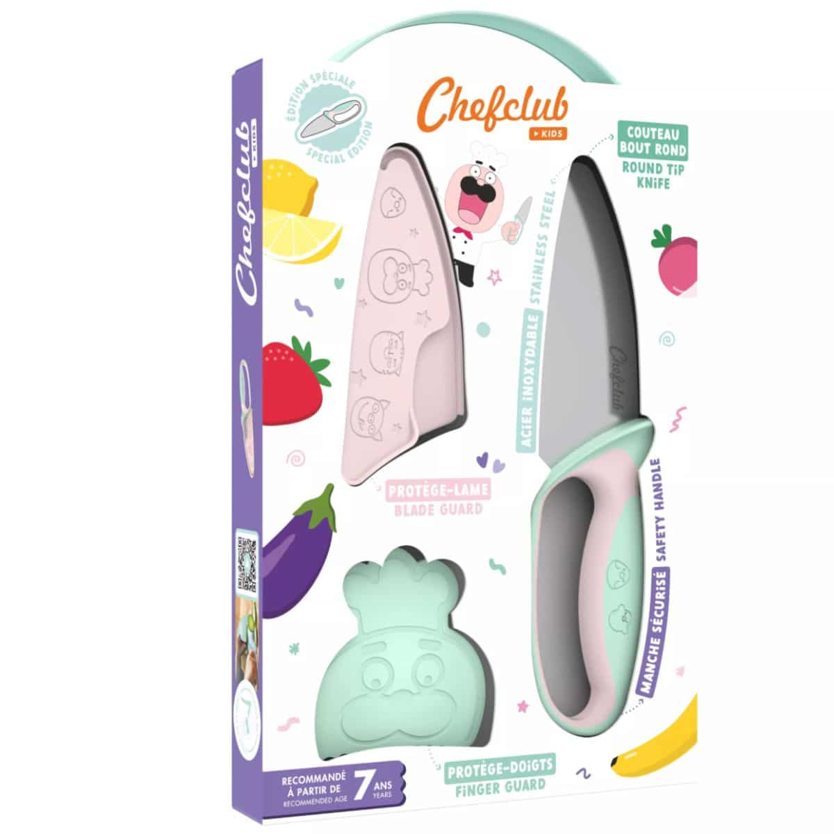 Les enfants peuvent désormais couper les aliments en toute sécurité ! Le couteau Chefclub Kids est doté d’un manche ergonomique qui offre une excellente prise en main, que l’enfant soit droitier ou gaucher. Il comprend également un protège-doigts adapté aux petites mains et une lame à bout rond pour une sécurité accrue. Un couteau de cuisine innovant adapté aux besoins des petits cuistots !