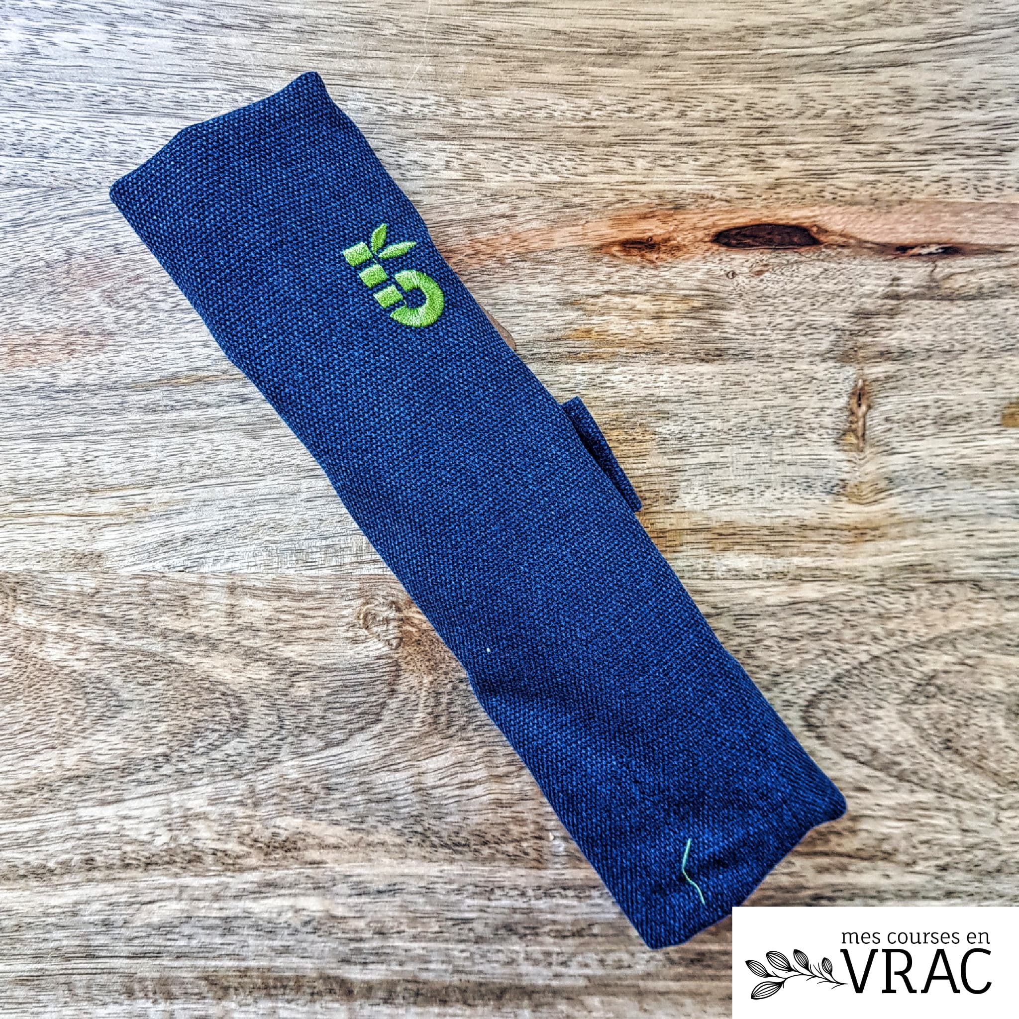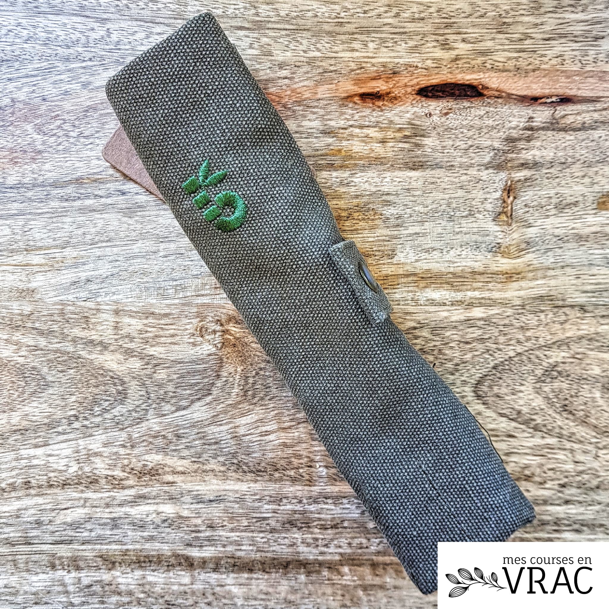 Les couverts sont emballés dans une jolie pochette en coton. Cette pochette est unie à l’extérieur et compartimentée à l’intérieur. Elle permet donc de disposer chaque couvert dans un compartiment pour qu’ils ne glissent pas de la pochette. Elle se ferme avec un bouchon pression.