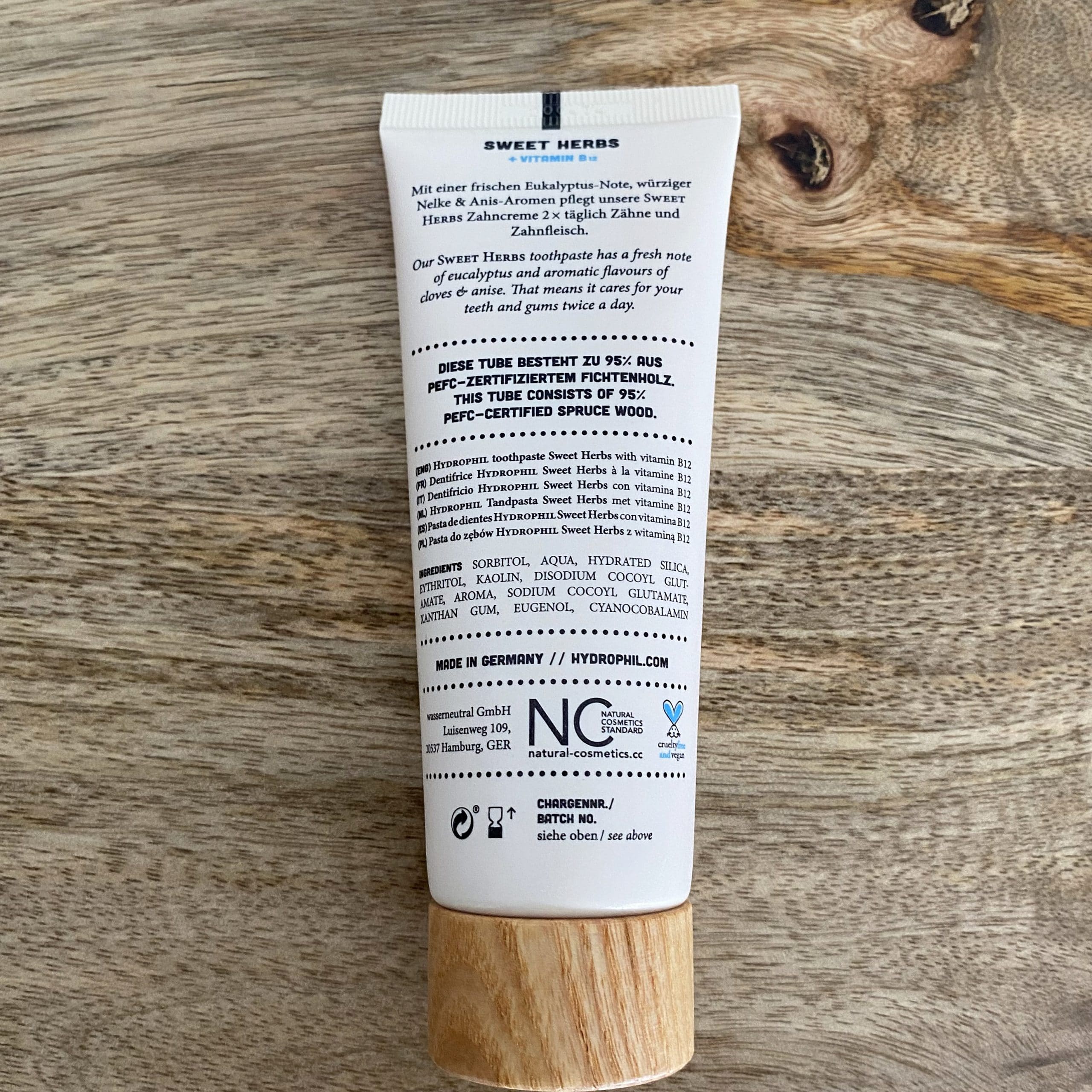 Le dentifrice HYDROPHIL a un goût frais et agréable d’eucalyptus, il contient de la vitamine B12 et est sans fluor et vegan.
