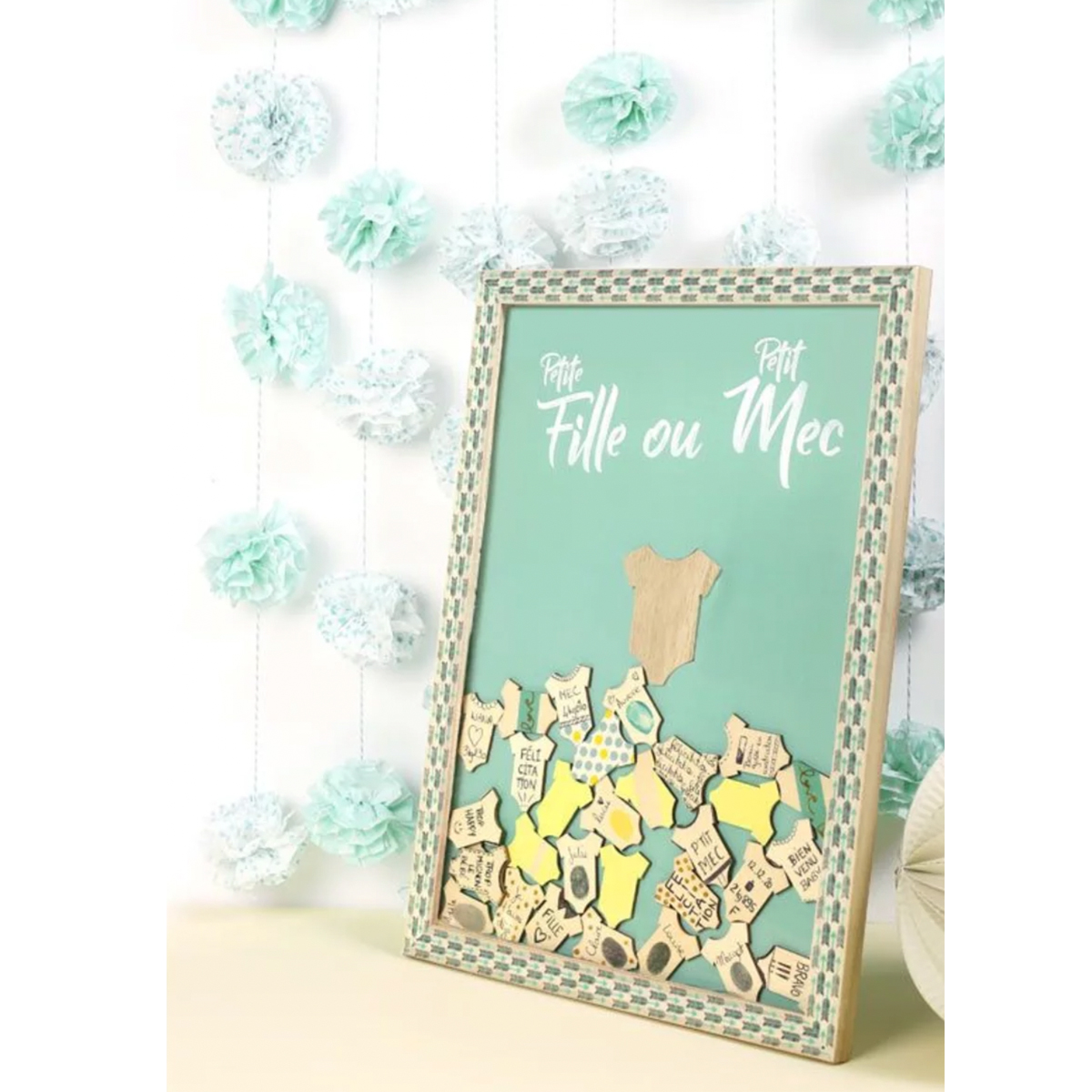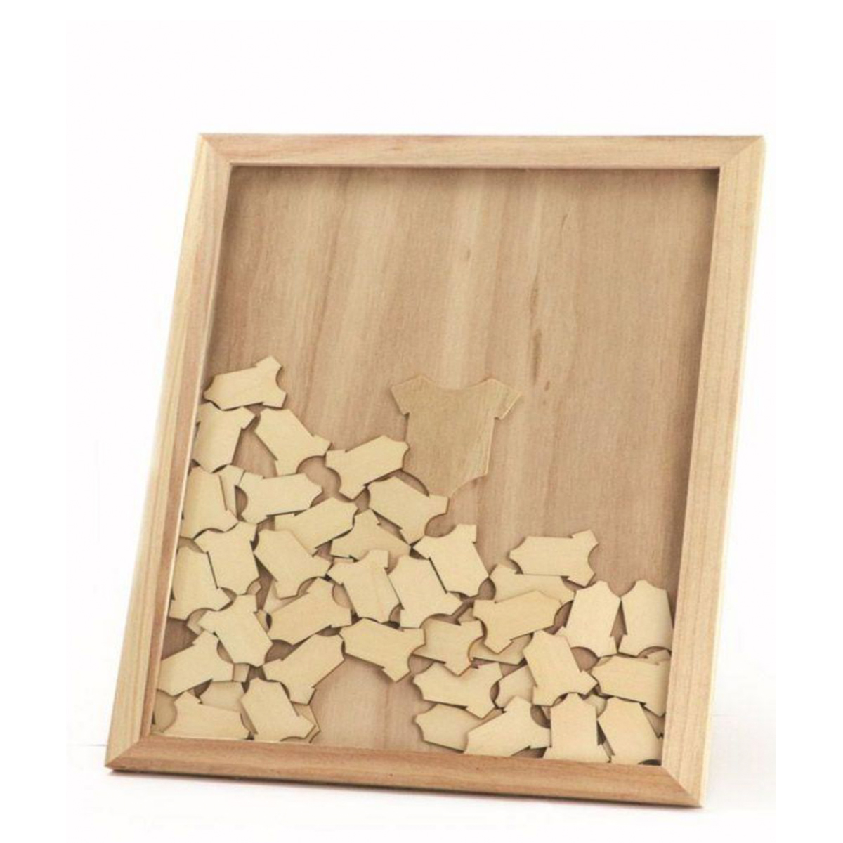 Estimation du poids, de la taille, du sexe, du prénom ou petite anecdote à inscrire sur le petit body en bois qui viendra se glisser dans le cadre à souvenirs.