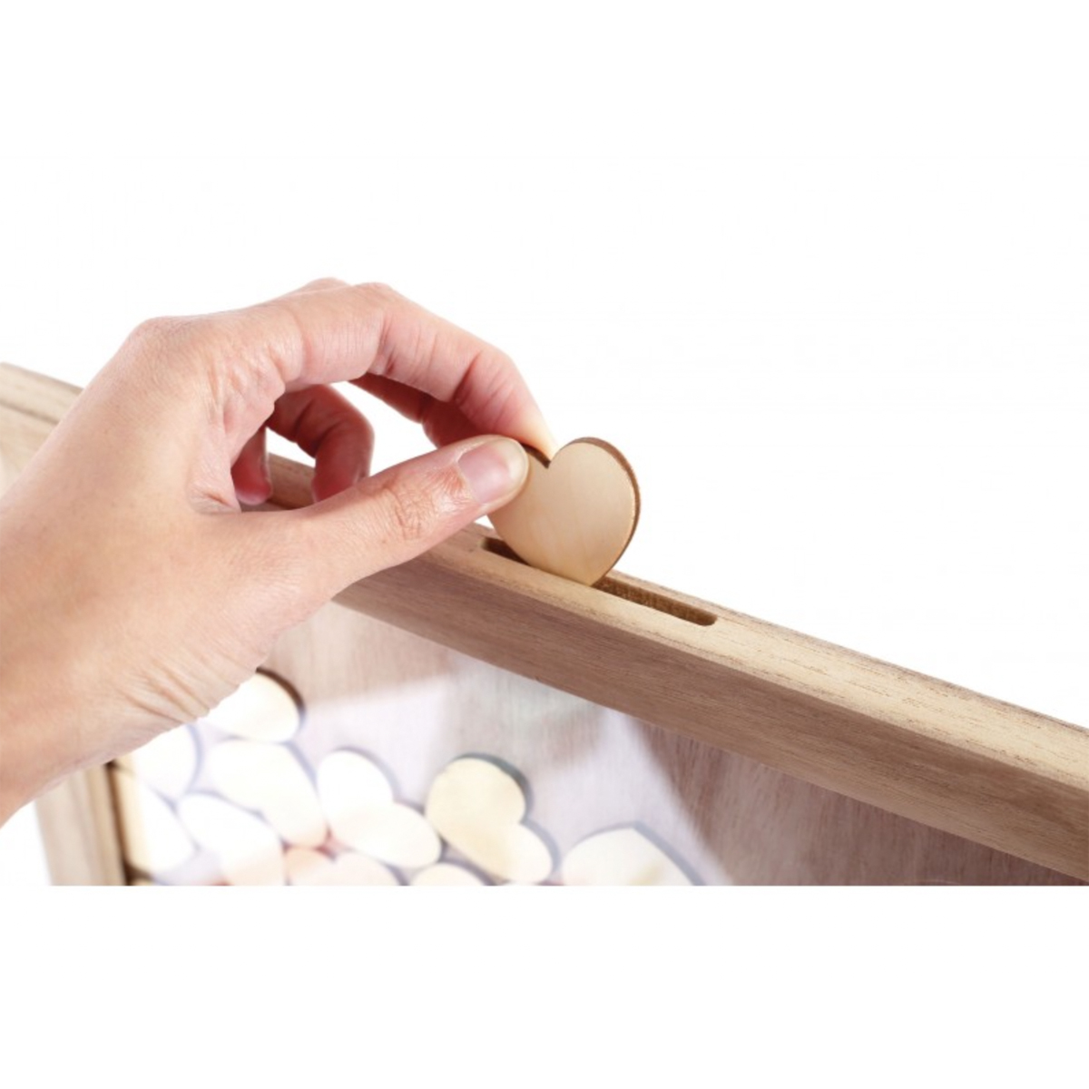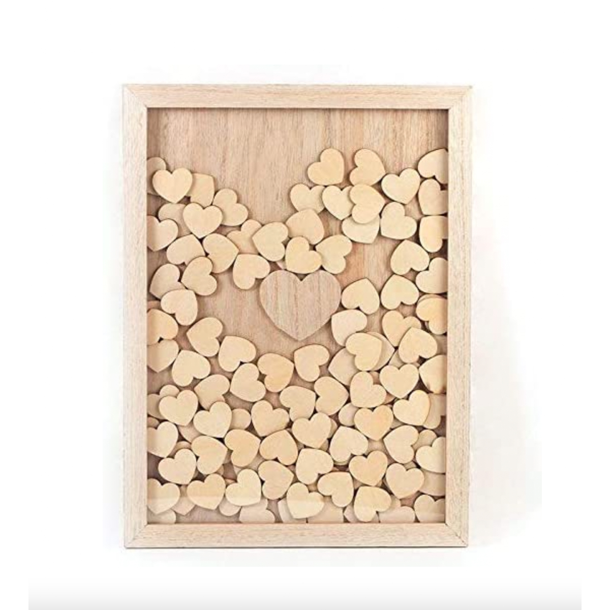 Voeux de bonheur, petit mot d’amour, anecdote à inscrire sur le petit coeur en bois qui viendra se glisser dans le cadre à souvenirs.