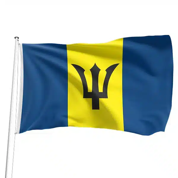 Le drapeau de Barbade, adopté officiellement le 30 novembre 1966, marque l’indépendance de l’île. Conçu par Grantley Prescod, il se compose de trois bandes verticales égales. Les deux bandes extérieures sont bleu outremer, tandis que la bande centrale est jaune doré. Le trident noir, symbole central, évoque Neptune, le dieu de la mer, avec une particularité : la rupture de son manche, représentant la fin de la domination coloniale britannique. Ce trident est aussi un rappel des valeurs démocratiques, chaque pointe symbolisant le gouvernement du peuple, par le peuple, pour le peuple.