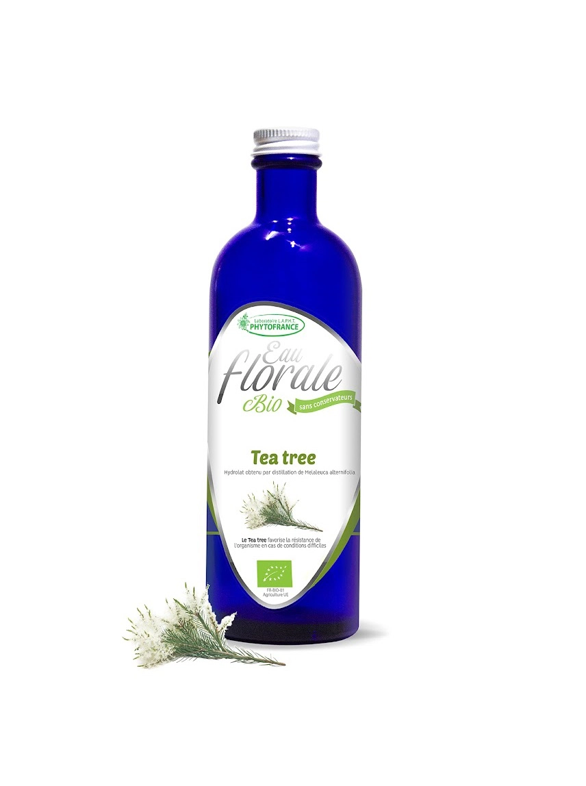- L’eau florale de tea tree est contient des terpénols, des composés naturellement antibactériens et assainissants. Elle aide à lutter contre les bactéries responsables des imperfections cutanées (acné, points noirs), sans agresser la peau.