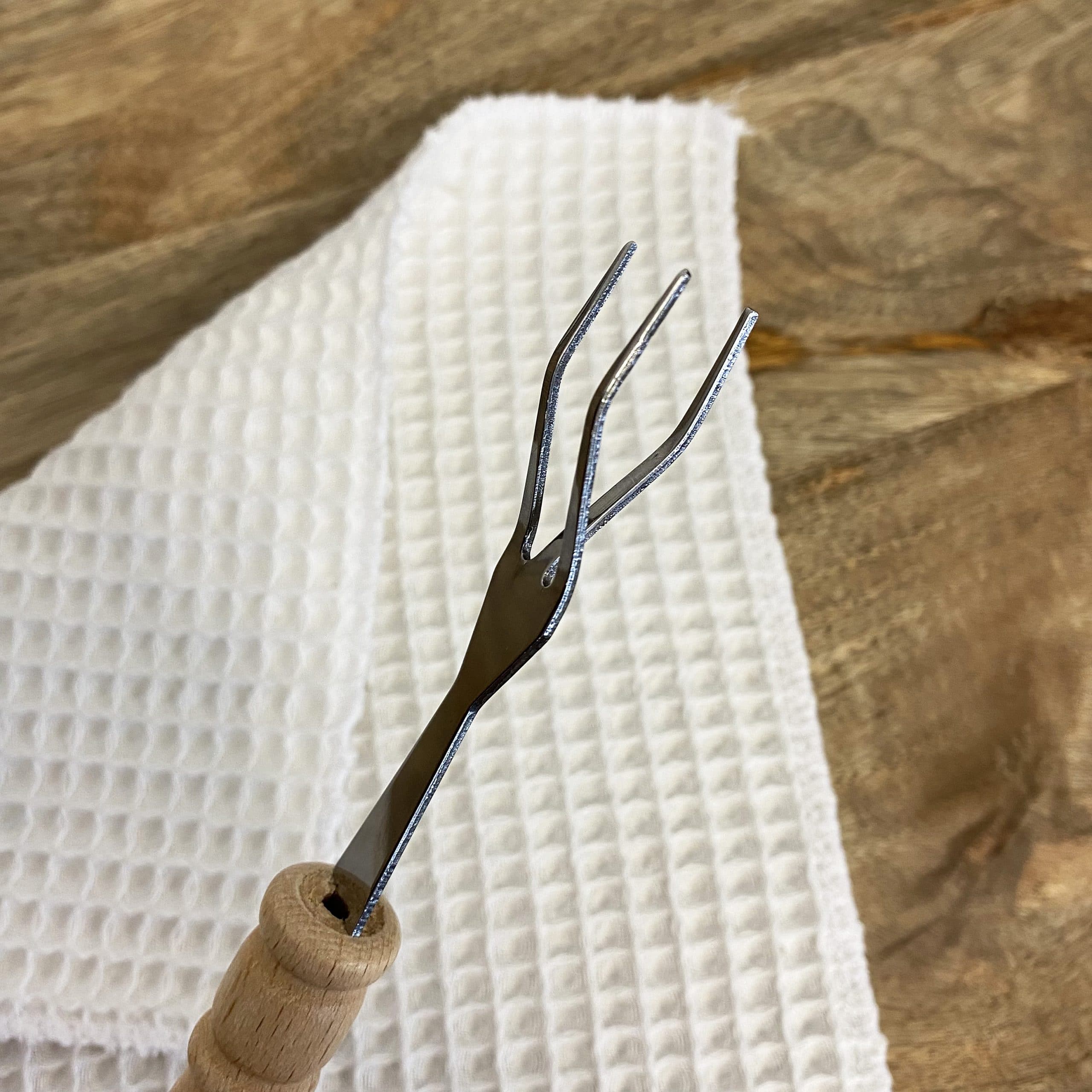 Cette fourchette permet de saisir une pomme de terre cuite plus facilement afin de l’éplucher sans se brûler et sans l’écraser.