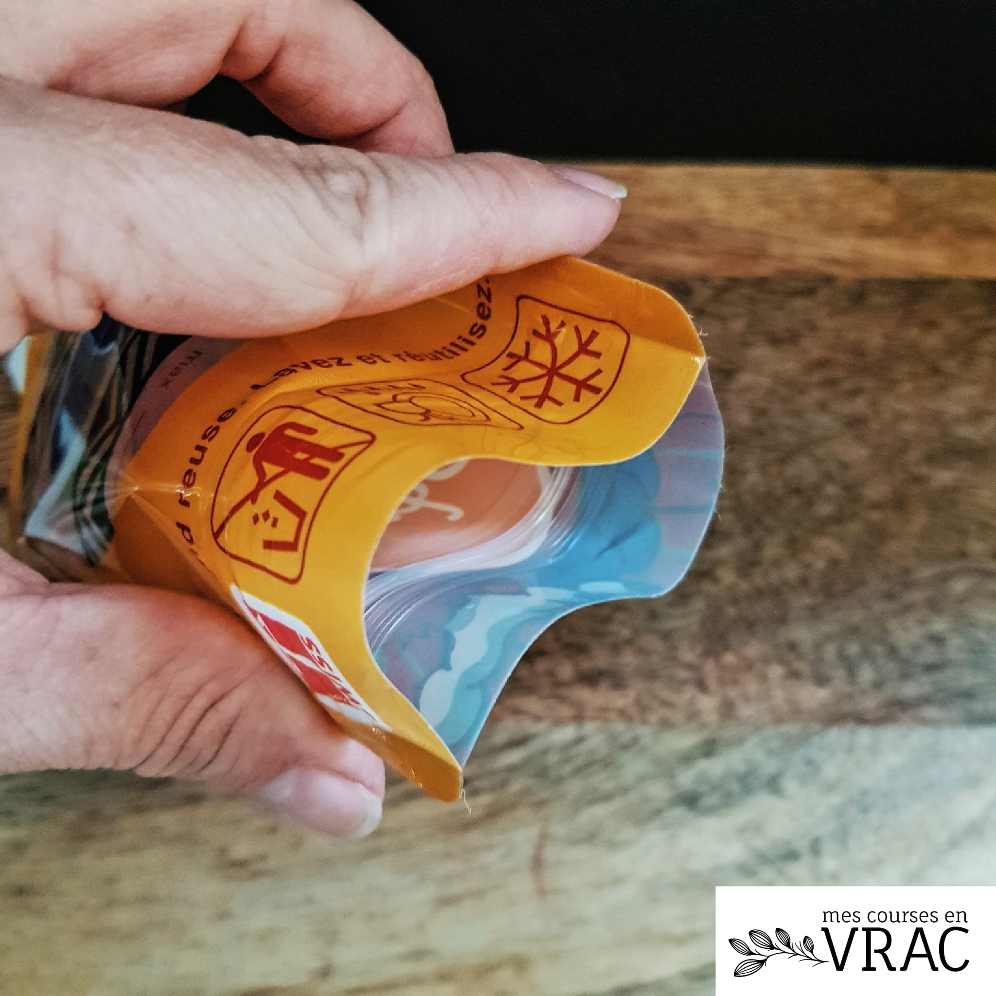 La gourde à compote réutilisable est fermée à l’arrière par un « zip » qui ressemble aux zips des sacs de congélations par exemple. Ce zip est très robuste et ne fuira pas une fois bien fermé.