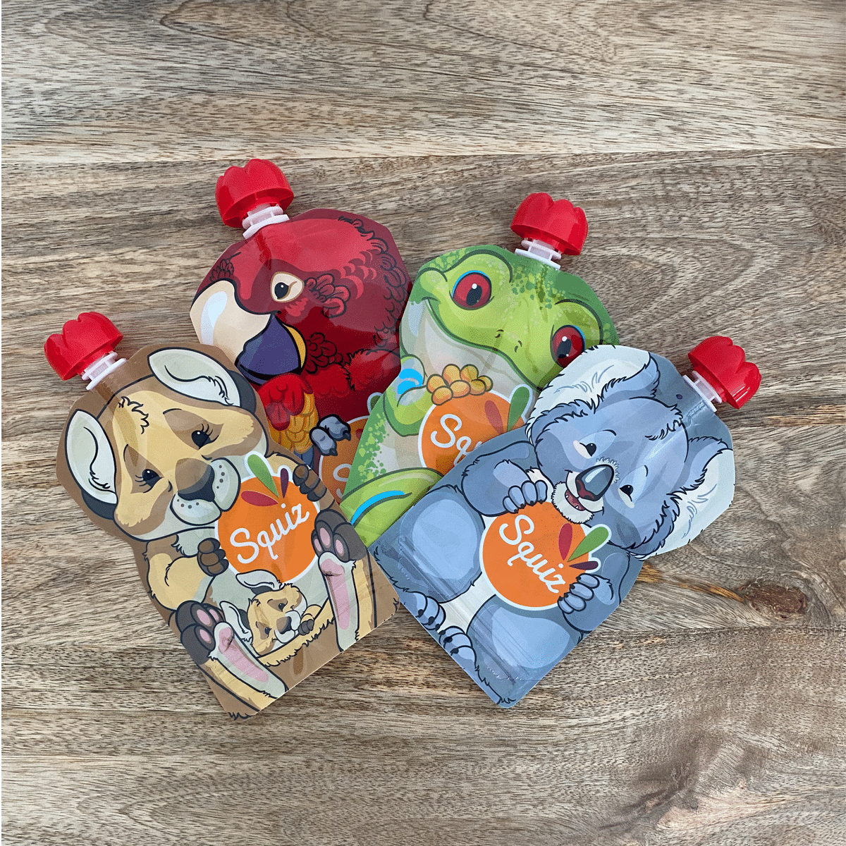MATÉRIAUX 100 % EUROPÉENS : les gourdes à compote réutilisables sont faites de plastiques recyclables exclusivement fabriqués et imprimés en Europe (Italie, Allemagne, France). Ces plastiques sont naturellement garantis sans PVC ni BPA (conformément à la loi Nº2010-729). Elles sont conditionnées dans une pochette qui est elle-même réutilisable et fabriquée entièrement en France avec un film plastique en polypropylène recyclable, une alternative écologique au PVC.