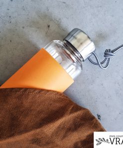 Cette bouteille en verre est idéale pour éviter les bouteilles en plastique au quotidien. Le verre ne donne pas de goût à l’eau et se réutilise à l’infini. Pour protéger le verre qui peut parfois être fragile, un joli étui aux couleurs joyeuses protège la gourde.