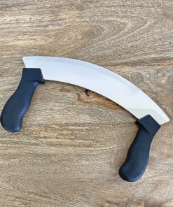 Hachoir en forme de demi-lune avec deux poignées pour une bonne prise en main de l’outil.