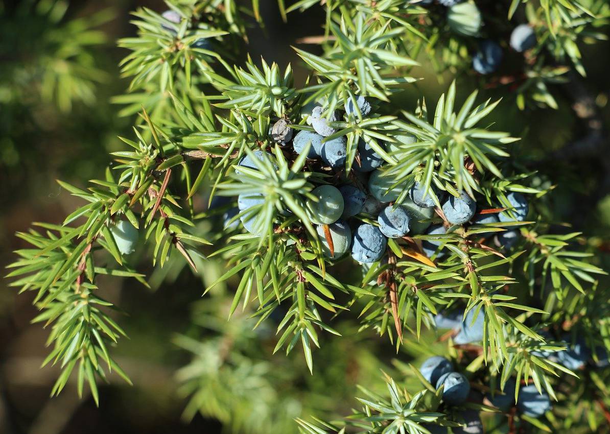 Particularités de la plante : ce petit conifère épineux et résineux pousse en buissons sur les pentes aux sols calcaires ensoleillés. Les branches ramifiées comportent de petites aiguilles vivaces et pointues légères, qui ressemblent à celles du romarin. A l’aisselle, elle possède des chatons (mâles) ou des bourgeons (femelles) qui donnent de petites baies rondes. Du vert, les baies passent au bleu sombre à maturité au goût sucré et résiné. Son utilisation dans les préparations culinaires et thérapeutiques remonte à l’Antiquité.