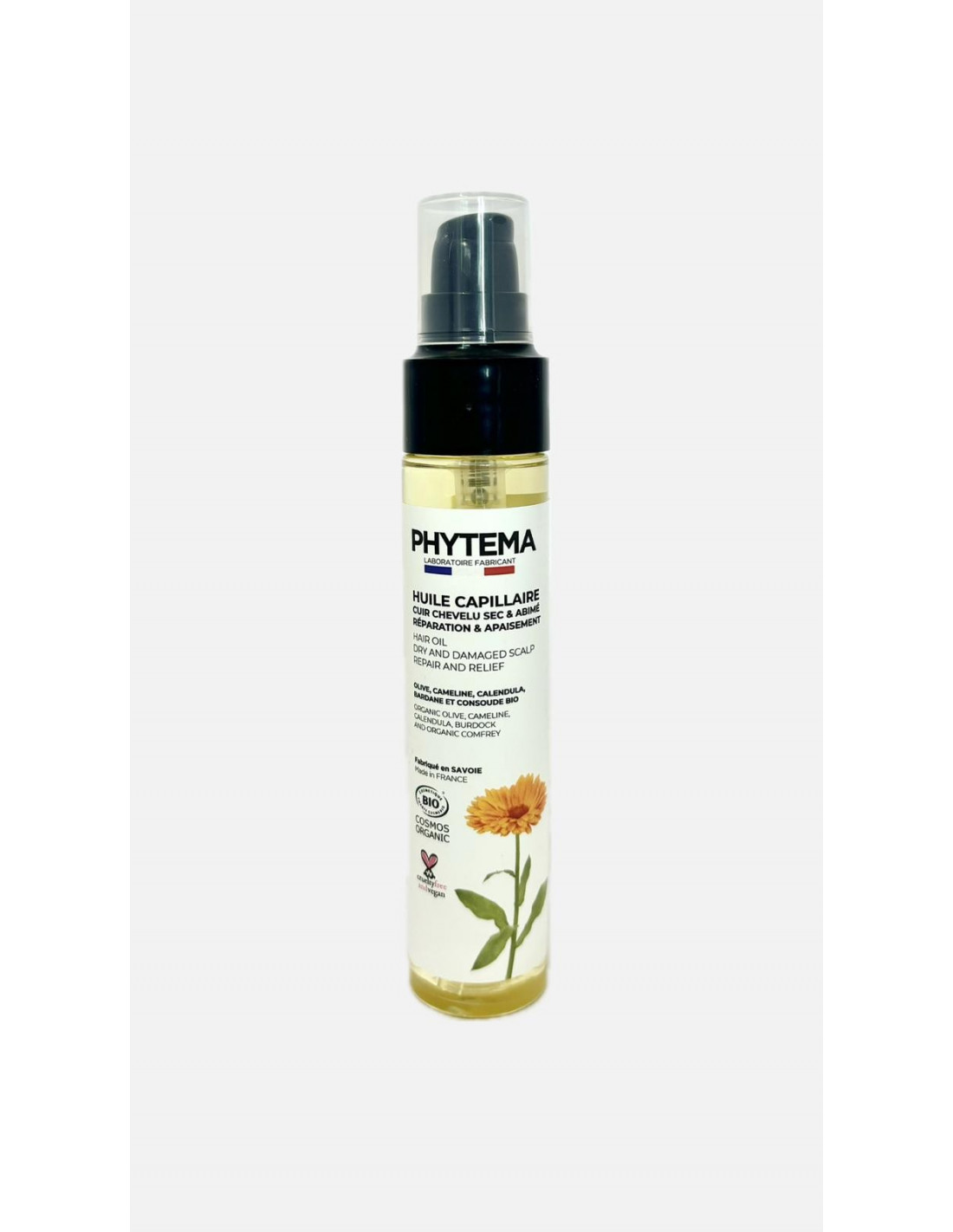 Huile cuir chevelu Réparation & Apaisement s’utilise en Avant shampoing pour protéger et soulager le cuir chevelu des irritations à base d’huiles végétales biologiques d’olive, caméline et calendula et d’extraits naturels de bardane et de consoude bio.