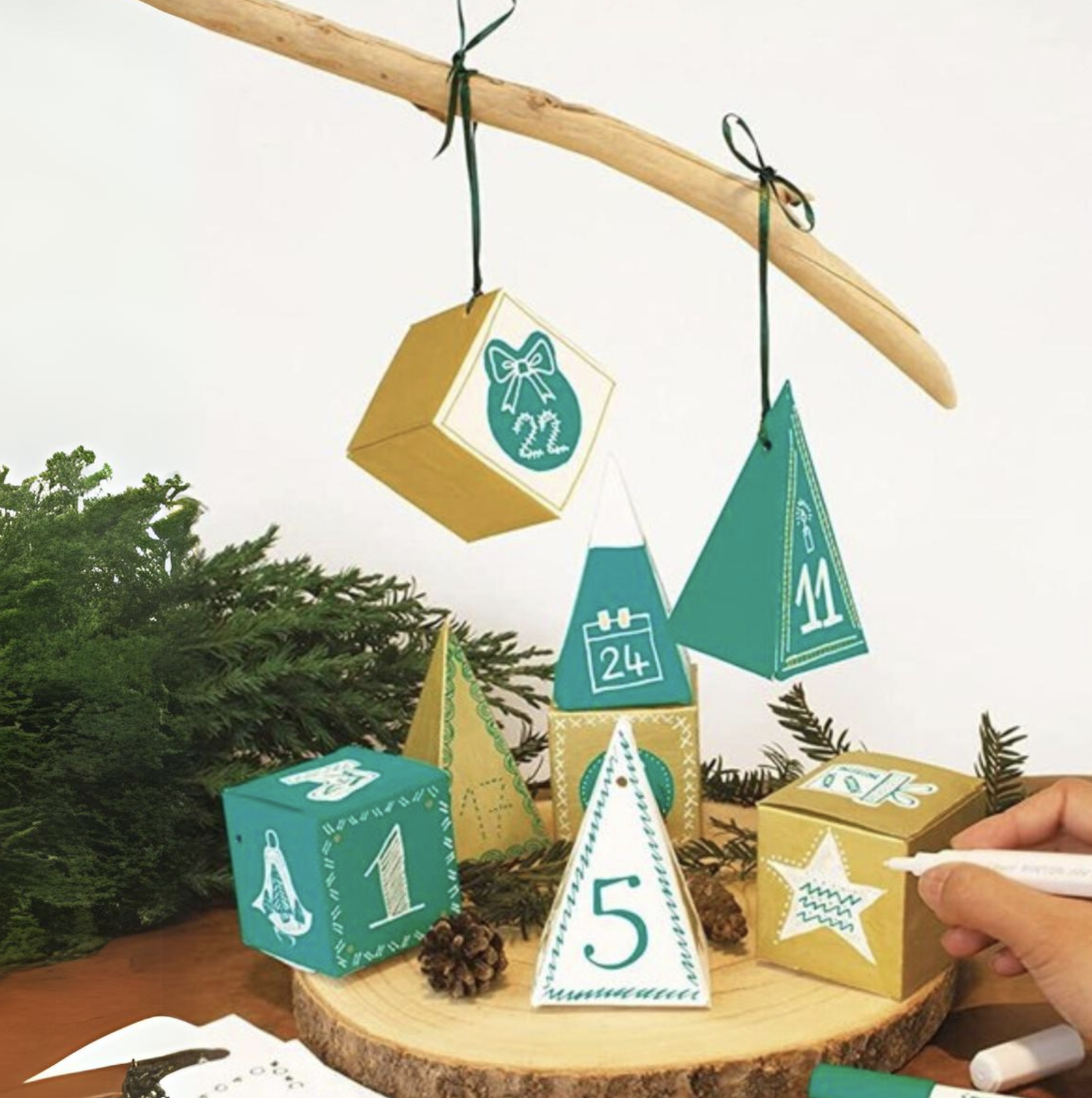 Ce kit contient tout ce dont vous avez besoin pour fabriquer vous-même votre calendrier de l’avent : 3 x marqueur à pigment, 1 de chacune des couleurs blanc (extra fin), vert et or (fin) 24 x boîtes et pyramides, avec ficelle