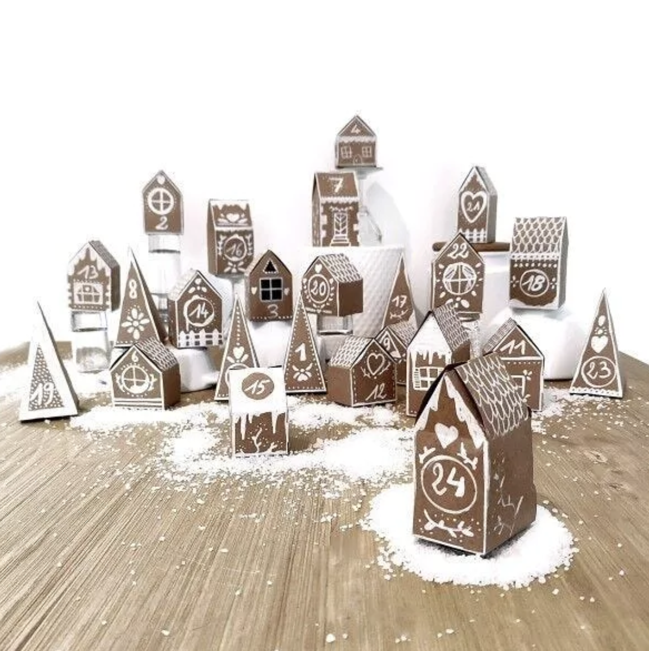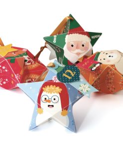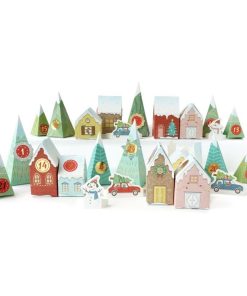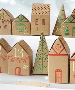 Ce kit contient tout ce dont vous avez besoin pour fabriquer vous-même votre calendrier de l’avent : 18 boîtes en forme de maison à monter, 6 boîtes en forme d’arbre ainsi que 24 étiquettes.