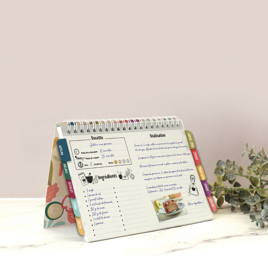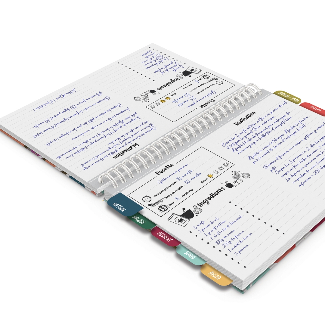Vous y trouverez également une planche de conversion ( tasse, cuillère à café, litre, cl, degrés du four …) et des stickers colorés à apposer à côté de vos recettes (express, rapide, exotique, de saison…)