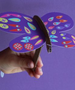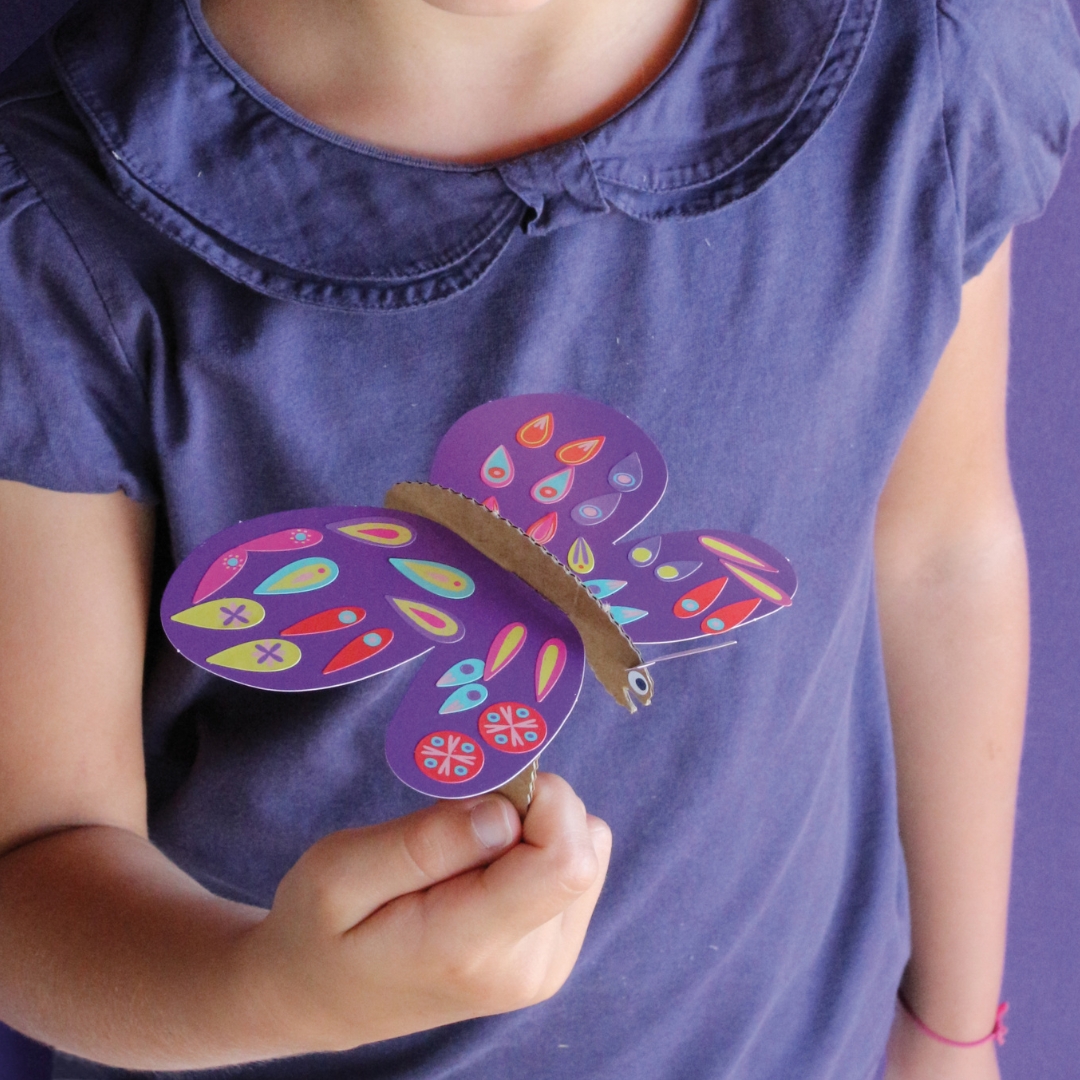 Un atelier pétillant et coloré : 6 papillons en carton et papier à créer, à décorer de stickers puis à activer de bas en haut pour les faire s’envoler !