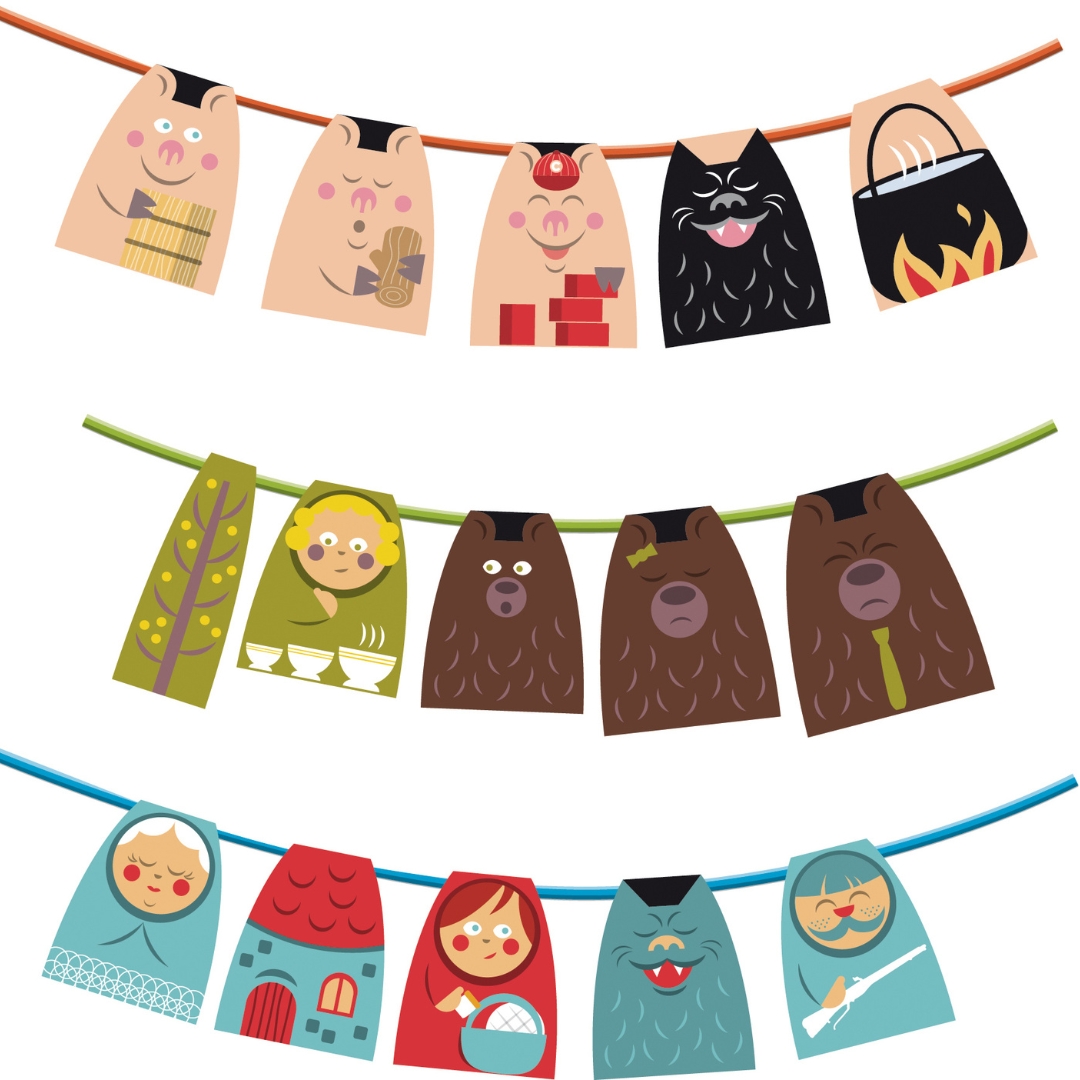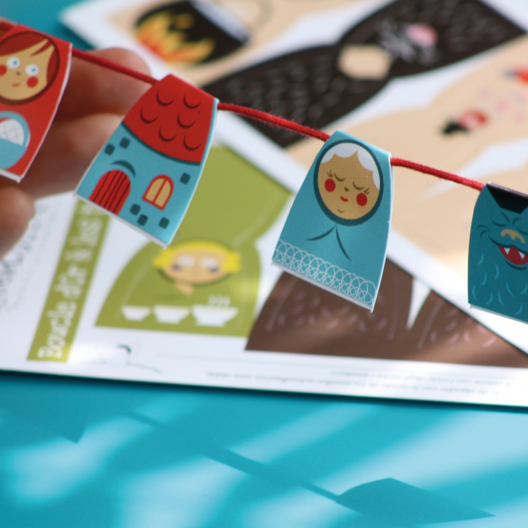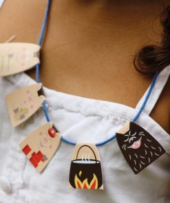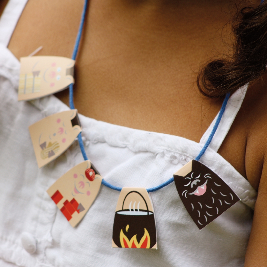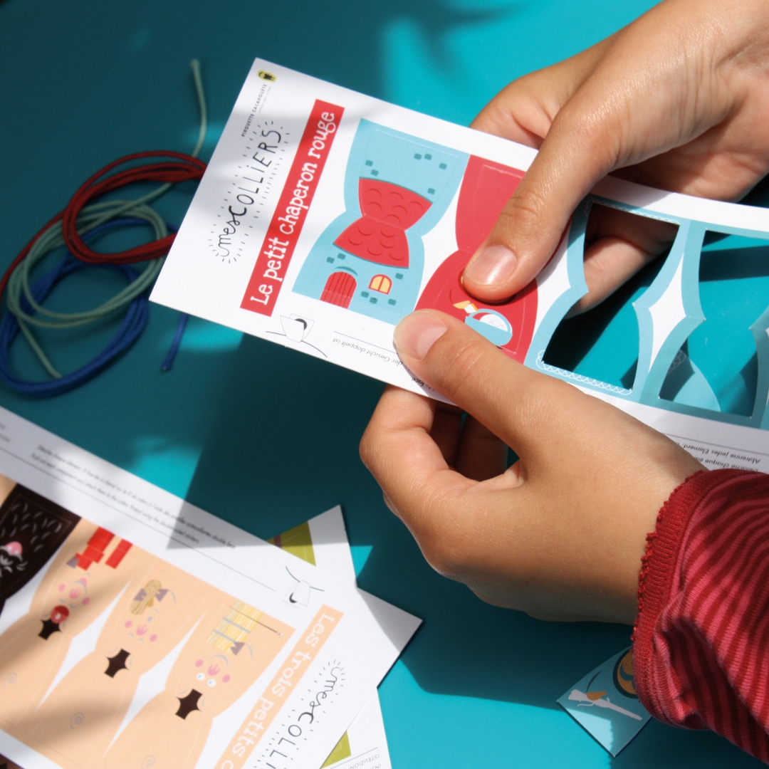 Un atelier romanesque où chaque collier au fil argenté raconte une histoire populaire : le Petit Chaperon Rouge, les 3 Petits Cochons et Boucle d’Or et les 3 Ours.