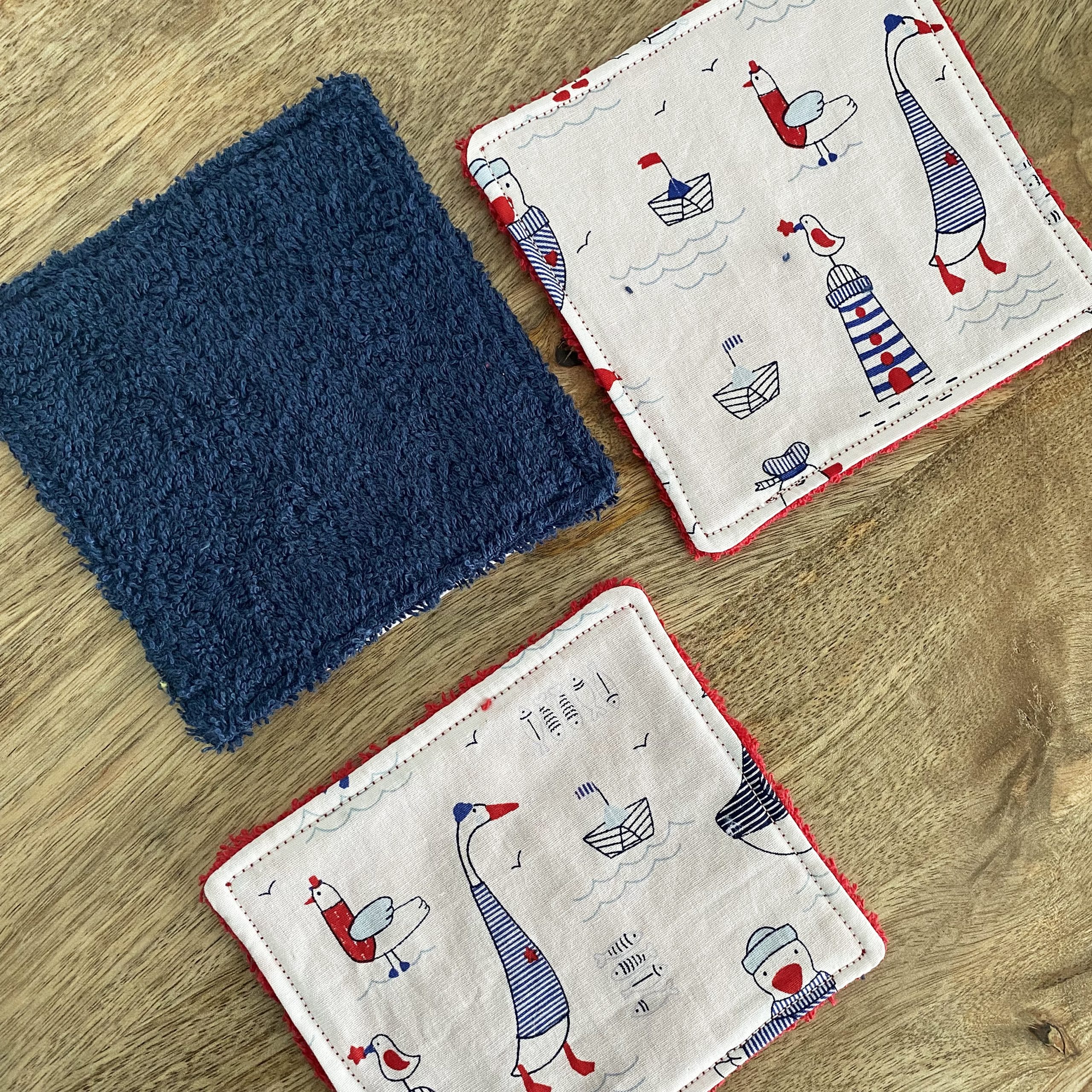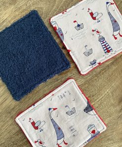 - Trois cotons lavables 11,5 x 11,5 cm avec un coté en éponge uni et l’autre côté en coton à motifs, idéal pour la toilette et débarbouiller bébé.