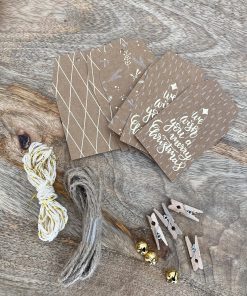 Ce petit kit vous permet de préparer de beaux emballages cadeaux grâce à des petites décorations en kraft à accrocher avec de la ficelle en jute à vos paquets en tissus par exemple.