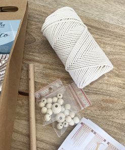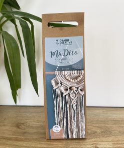 Ce kit de macramé permet de réaliser un coquillage suspendu en coton recyclé, accroché à un cylindre en bois il pourra décorer une pièce de vie par exemple.