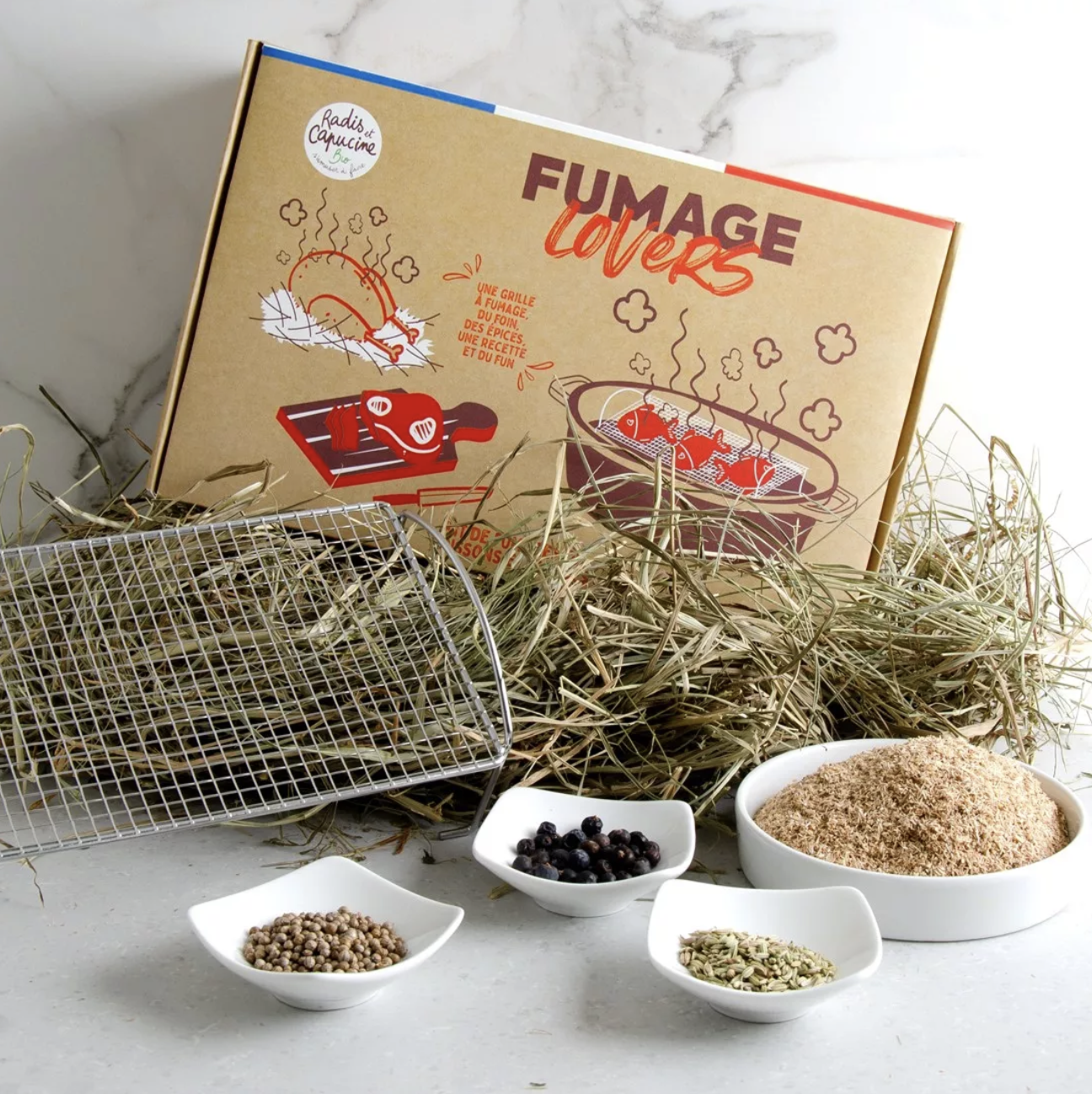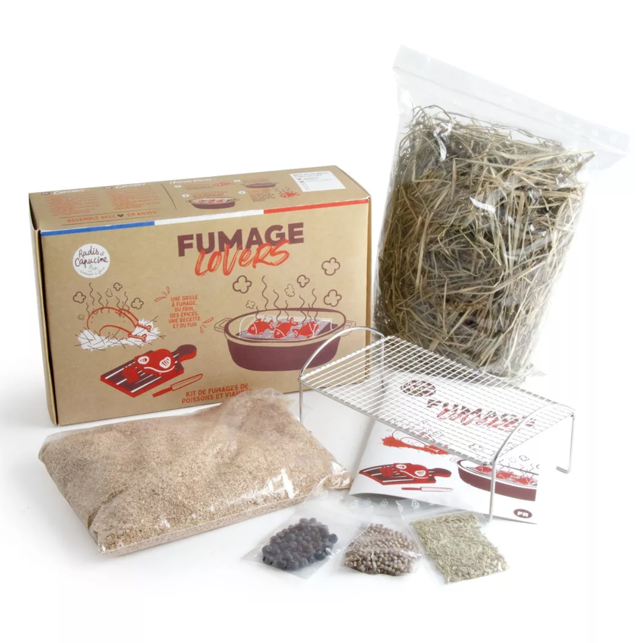 - 100 gr de foin de Crau bio (AOP, 3 Aromates bio pour parfumer son fumage : graines de coriandre bio, graines de fenouil bio et baies de genièvre bio et un livret d’instructions de 16 pages.