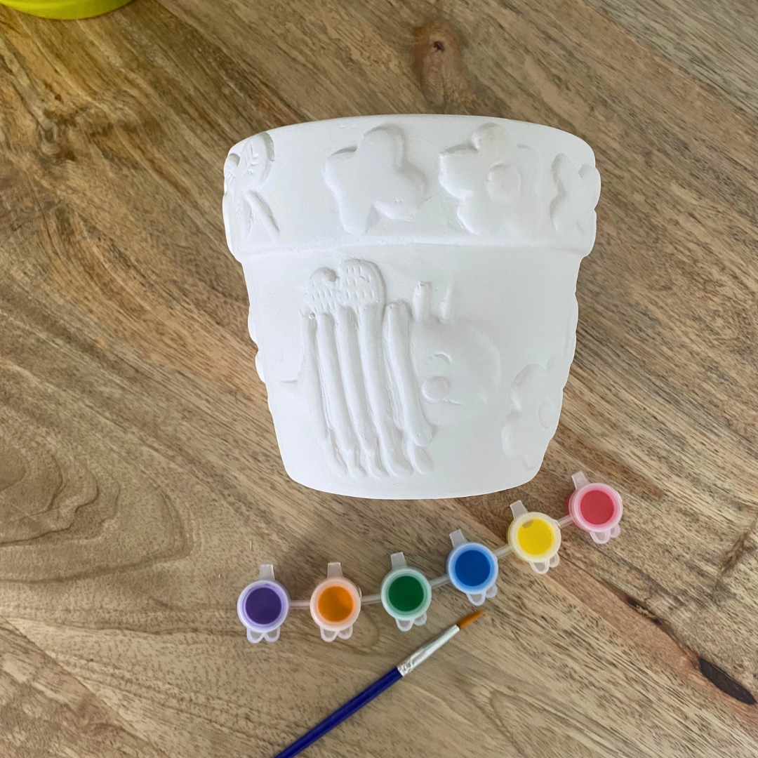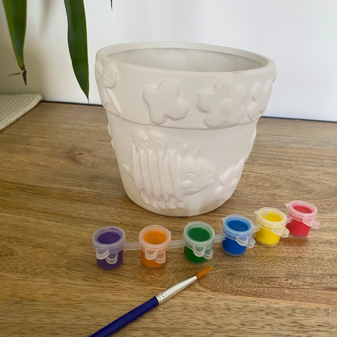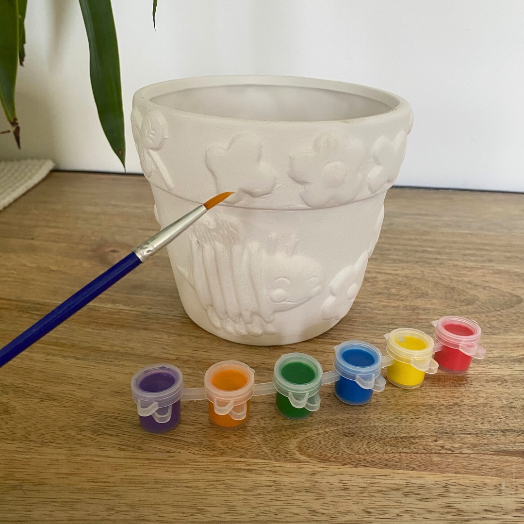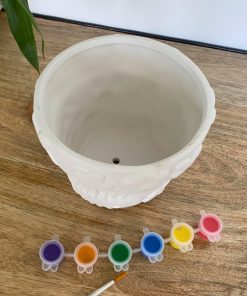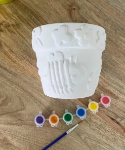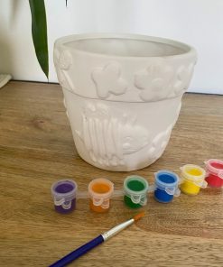 Ce set complet comprend un pot de fleurs à peindre ainsi que 6 pots de peinture et un pinceau.