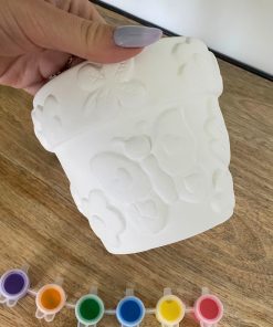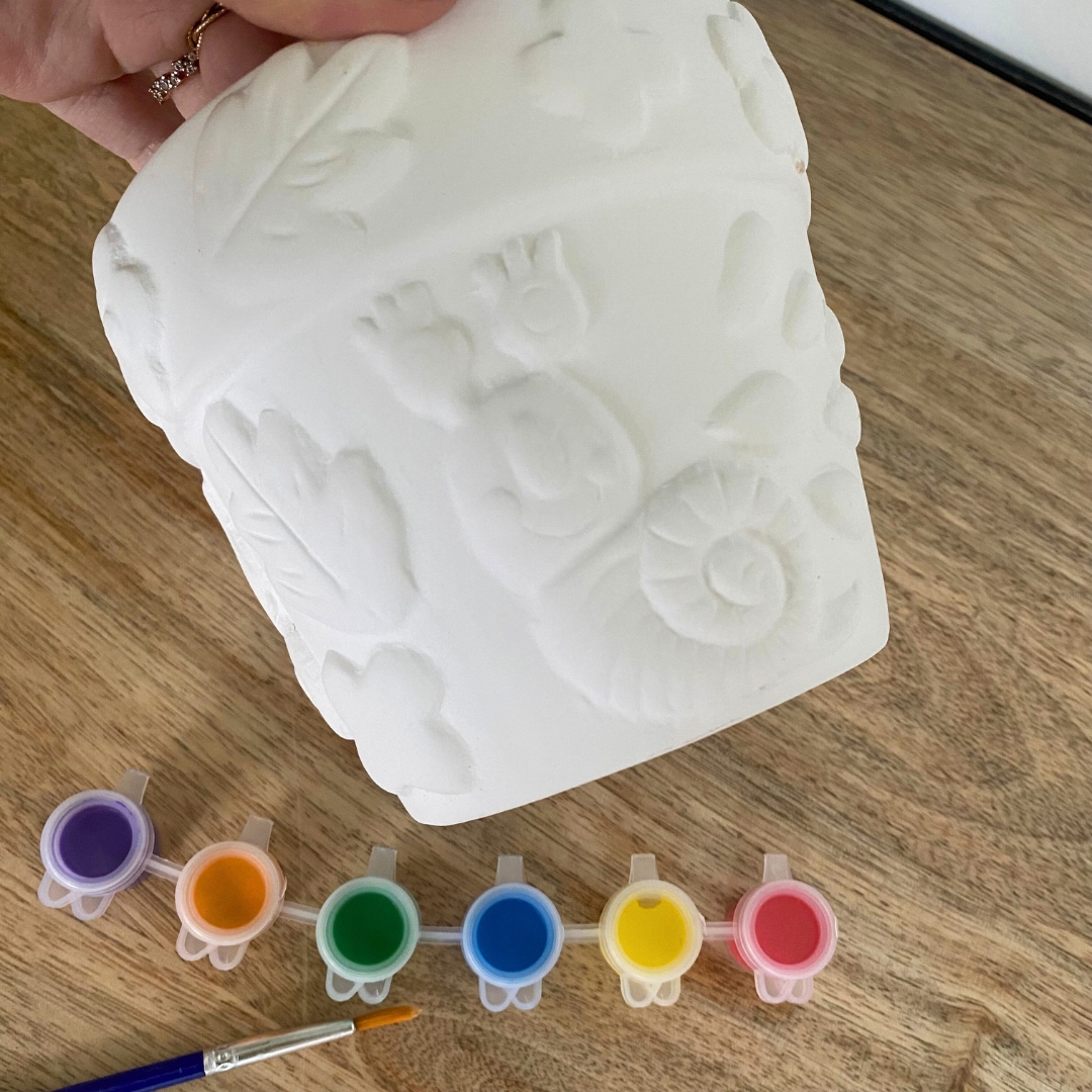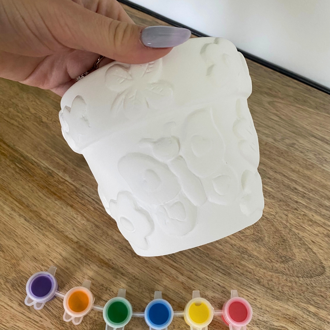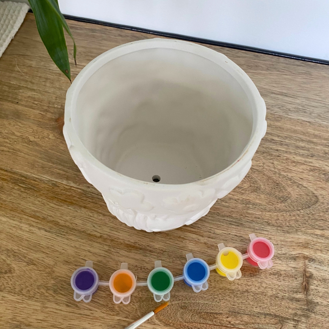 Ce set complet comprend un pot de fleurs à peindre ainsi que 6 pots de peinture et un pinceau.