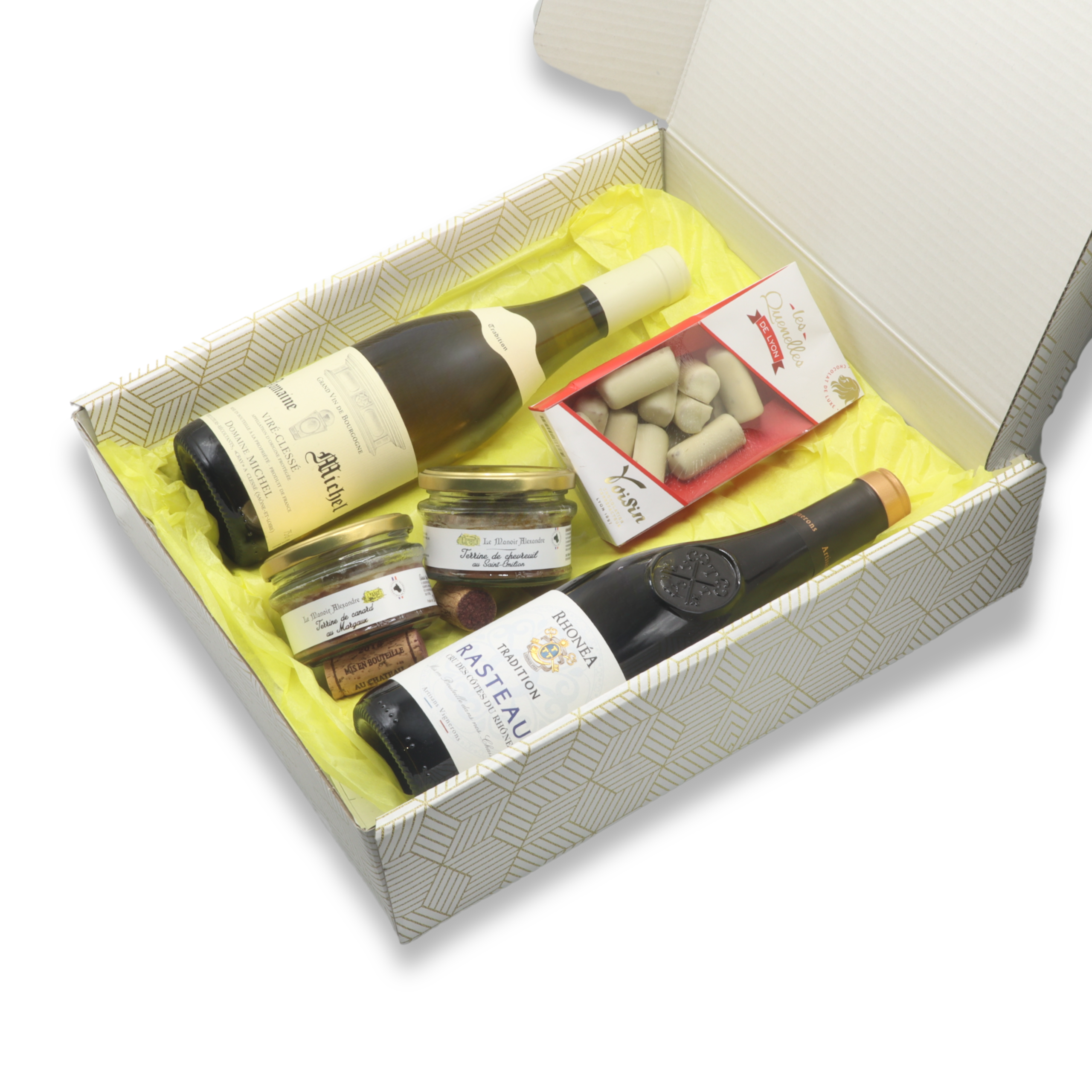 En effet, ce coffret comprend deux cuvées emblématiques et de grande renommée, ainsi que des gourmandises raffinées, comme les chocolats « Quenelles », spécialité lyonnaise de qualité provenant de la fameuse chocolaterie Voisin.