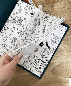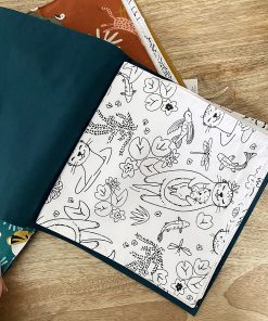 Ce cahier de coloriage en tissu est composé de 6 pages à colorier (motifs du quotidien, animaux, jungle…) et 6 pages blanches pour laisser libre cours à son imagination.