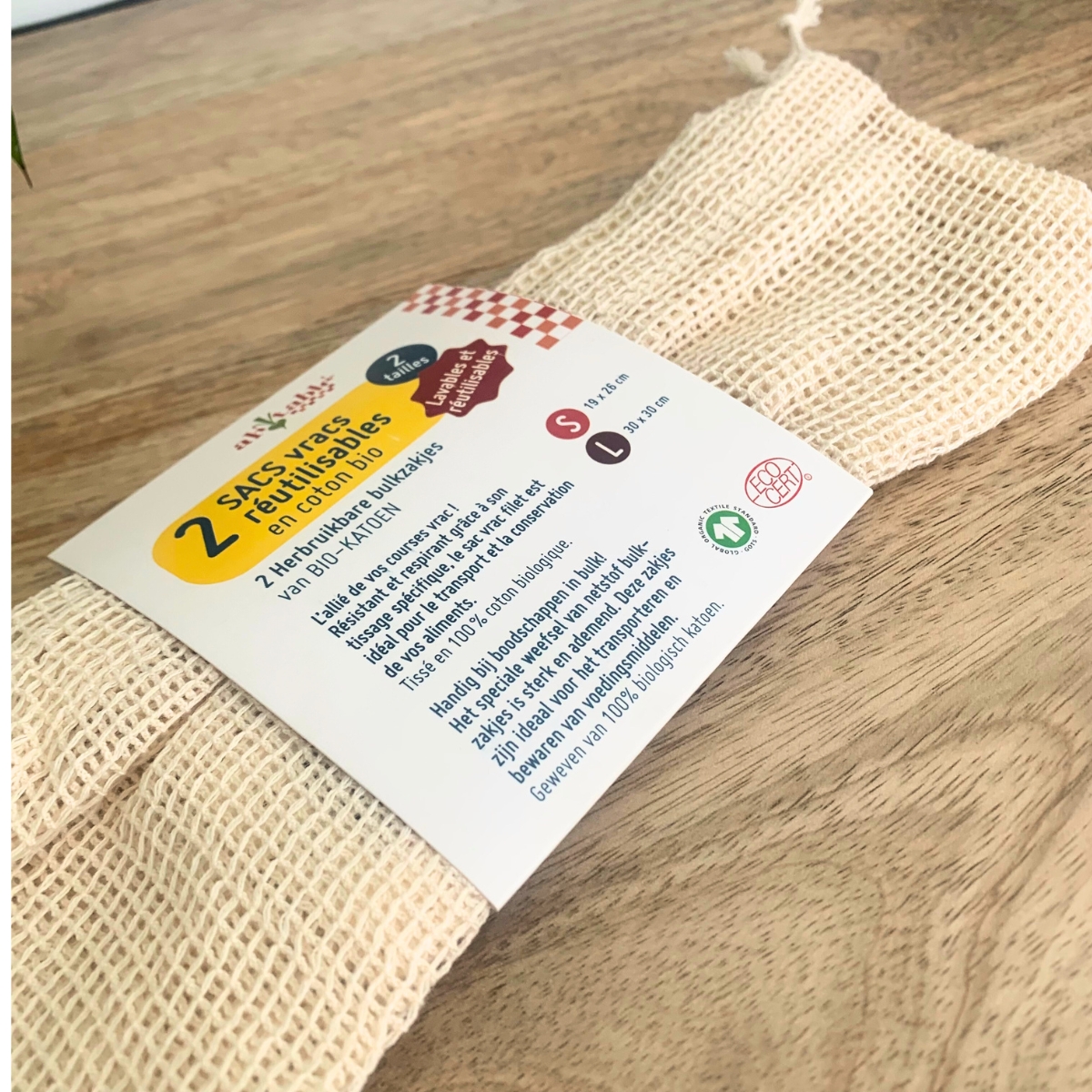 *Certifiés GOTS : ces sacs filet garantissent que le coton a été cultivé en bio, que les teintures utilisées sont écologiques et qu’une juste rémunération des travailleurs est assurée tout au long de la chaîne. Ils sont lavables et durables.