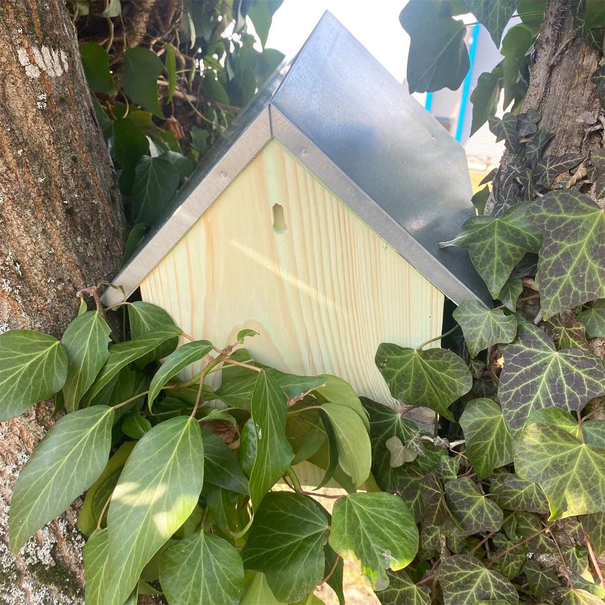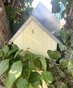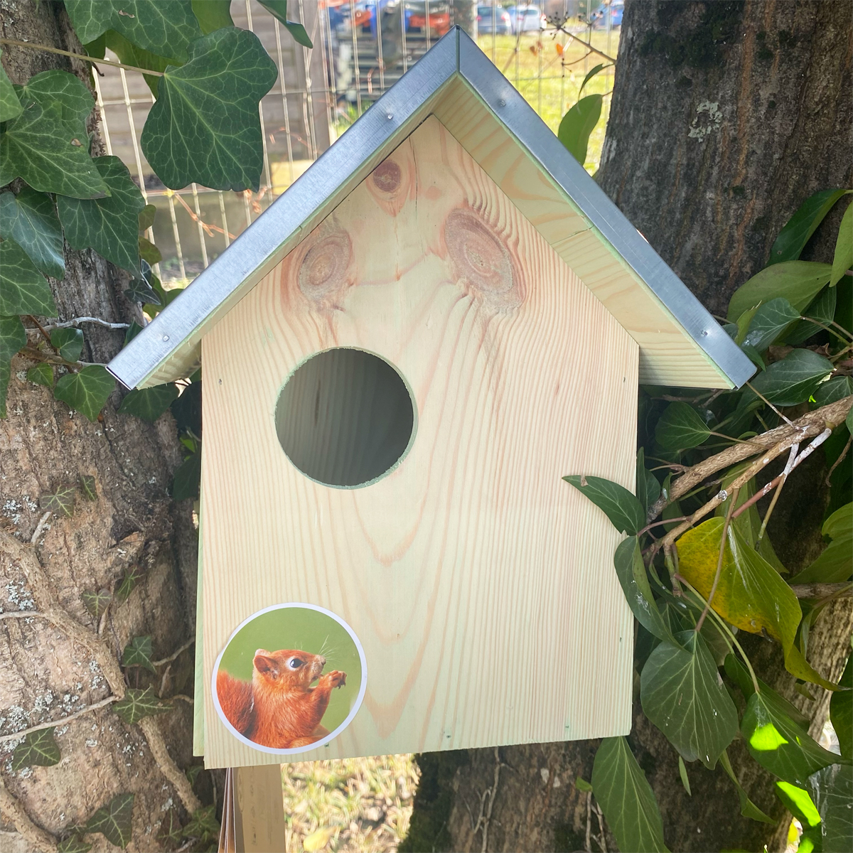Le toît de la maisonnette est métallique ce qui permet de protéger les écureuils des intempéries et du froid.