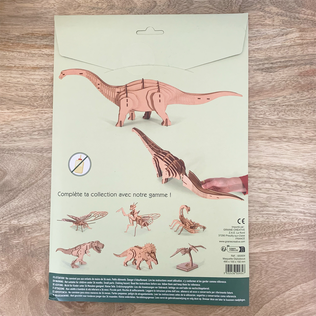 À base de bois, le diplodocus va prendre vie en 3D et pourra ensuite être customisé avec de la peinture, des paillettes …