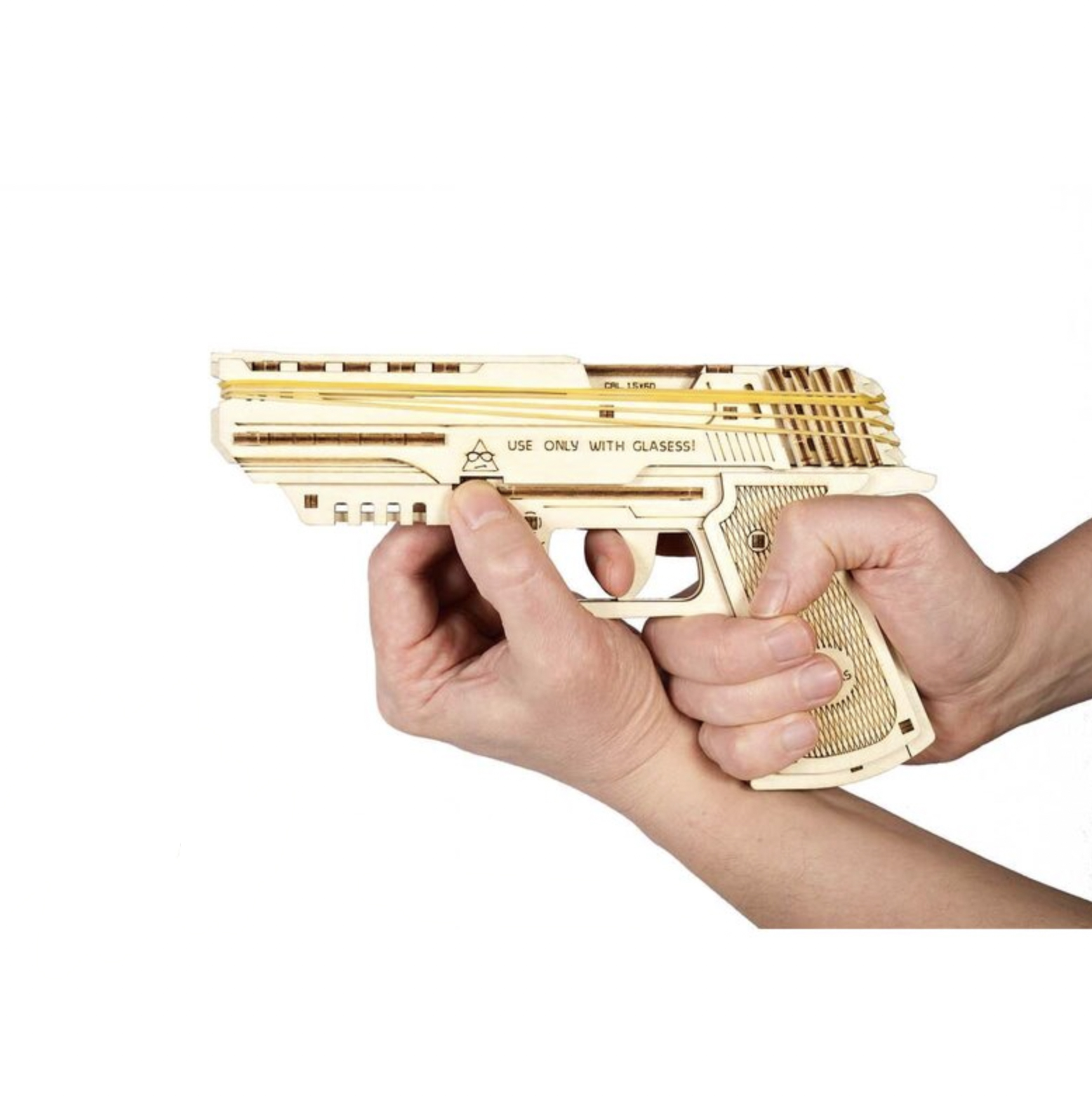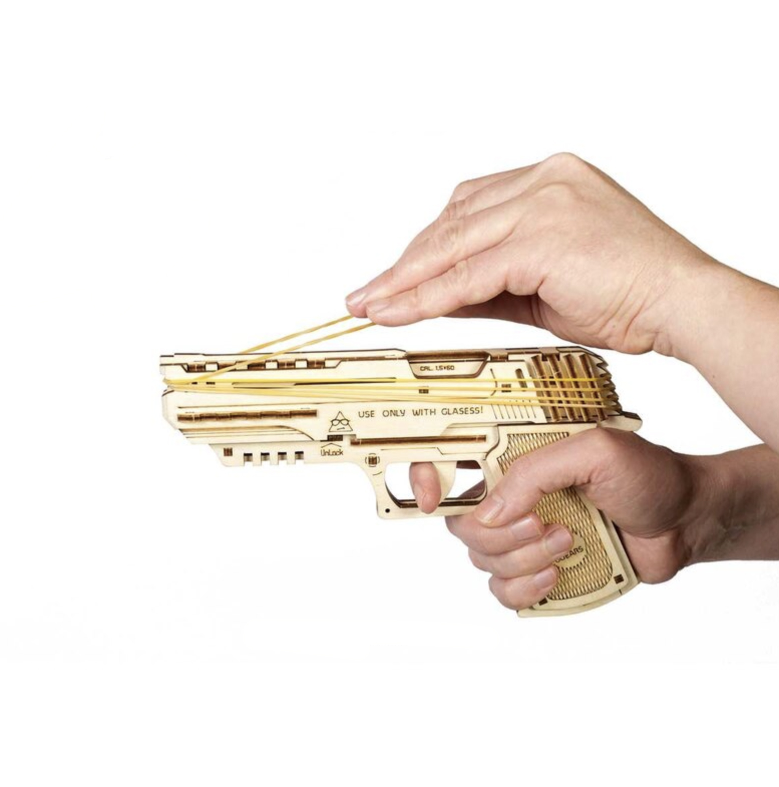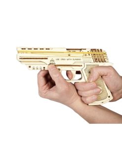 A base de contreplaqué, le pistolet 3D (modèle Pistolet Wolf-01) prendra vie à l’aide d’élastique à tirer pour s’amuser.