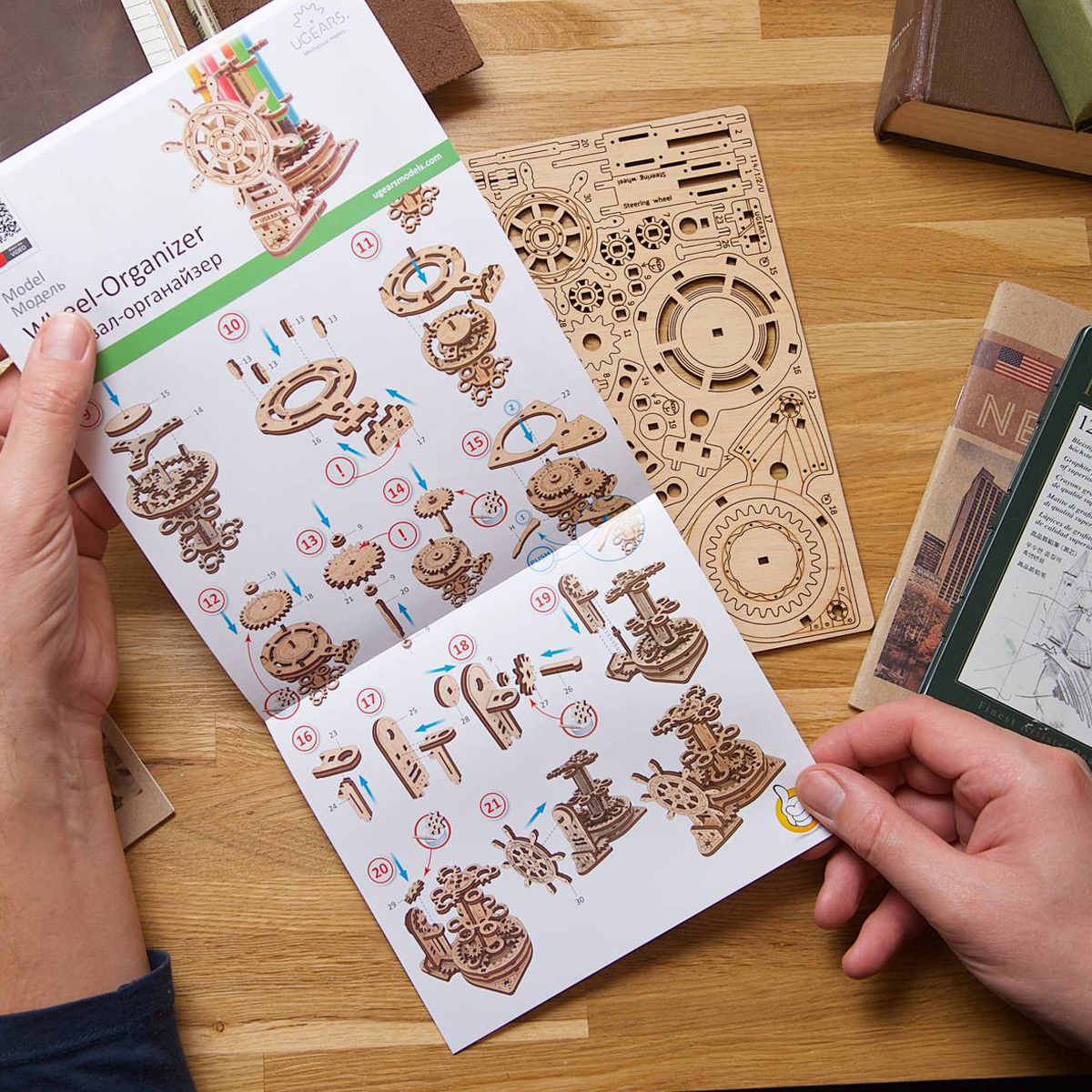 A base de contreplaqué, le porte stylos peut contenir jusqu’à 6 crayons, il est équipé du mécanisme planétaire de style « Steampunk » (rétrofuturiste) à l’intérieur.